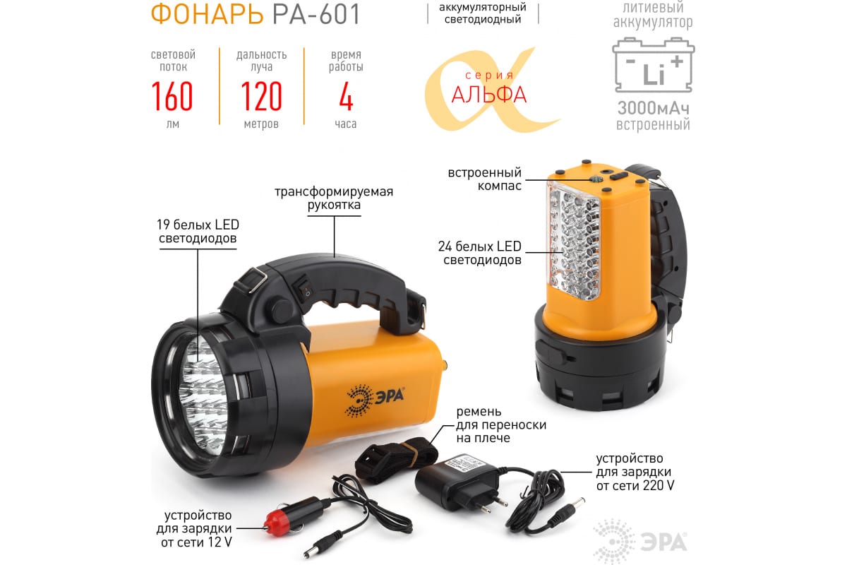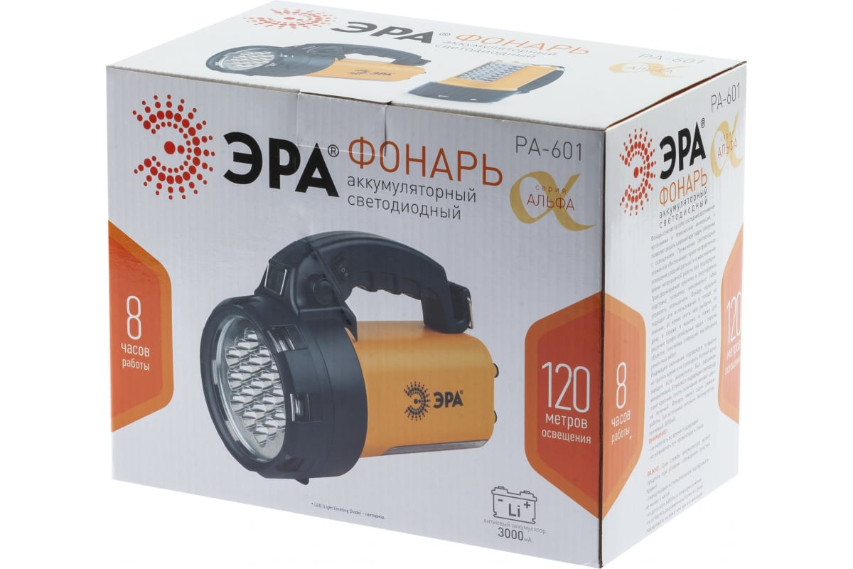 РА-601 - представитель серии фонарей ЭРА Альфа. В прожекторах этой серии установлены сверхъяркие светодиоды последнего поколения, которые обеспечивают качественное освещение высокой дальности (данная модель светит на 120 метров). Литиевый аккумулятор с высокой ёмкостью (3000 мАч) гарантирует оптимальное время работы без подзарядки (4 активных часа). В комплекте поставляется ремень для удобной переноски и два устройства для подзарядки от сети: 220 В и 12 В (автомобильный прикуриватель).