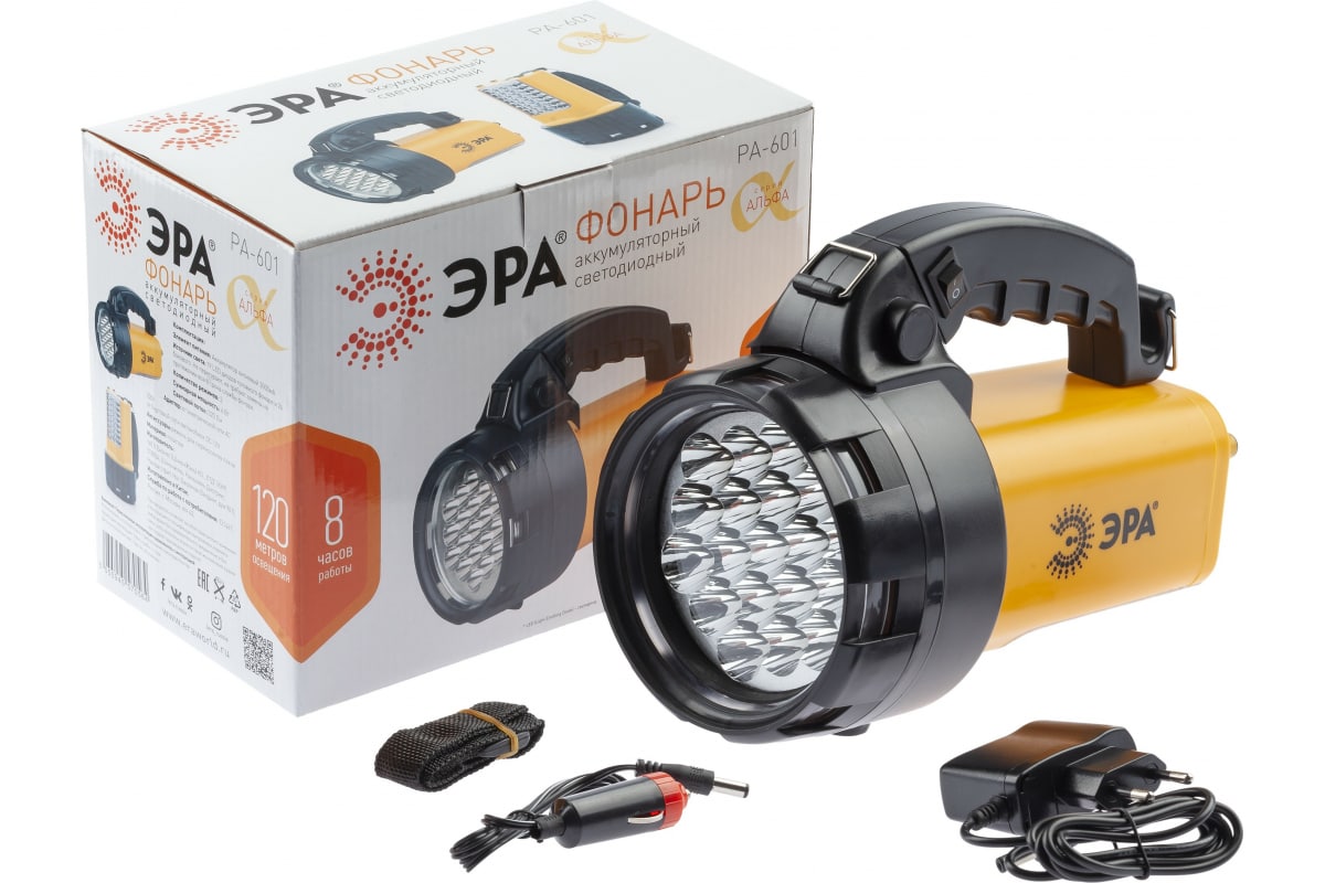 Светодиодный аккумуляторный фонарь прожектор ЭРА PA-601 АЛЬФА ручной мощный яркий Б0031036 - мощный фонарь-прожектор на литиевом аккумуляторе. Ярко светит, долго держит заряд, при этом очень лёгкий. Помимо основного направленного света (19 светодиодов), имеет боковой светильник с широким заливающим освещением (24 LED-диода).