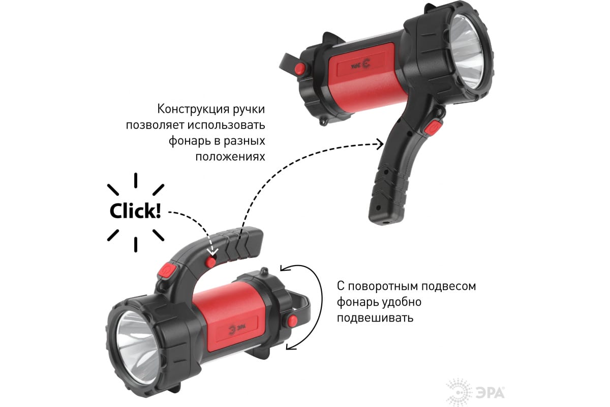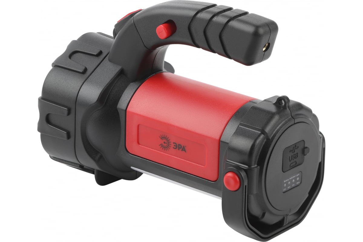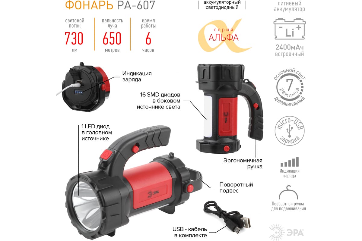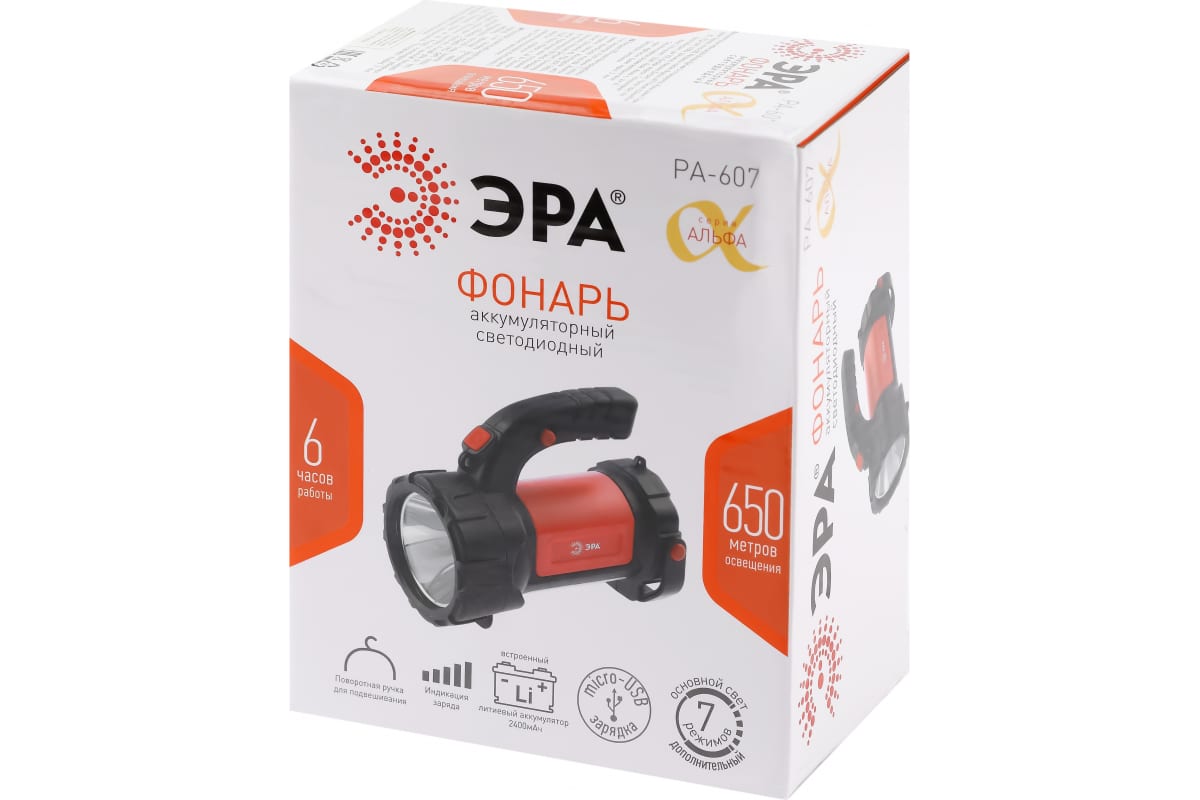 Фонарь отличается приятным дизайном и комфортом в использовании. В комплекте microUSB-кабель для подзарядки, имеется индикатор уровня заряда. При полном заряде работает непрерывно 6 часов. Благодаря емкому литиевому аккумулятору (2400 мАч) фонарь долго светит и мало весит. Удобно брать с собой, переносить, подвешивать и устанавливать на поверхность в качестве светильника. Идеальный вариант для кемпинга! Многофункциональность ЭРА PA-607 обеспечивается 7 режимами работы: основной свет, 100% яркости; основной свет, 50% яркости; мигание; боковой свет; боковой свет 50% яркости; боковой свет красный; боковой свет красный мигание.. Эргономичная ручка и поворотный подвес.