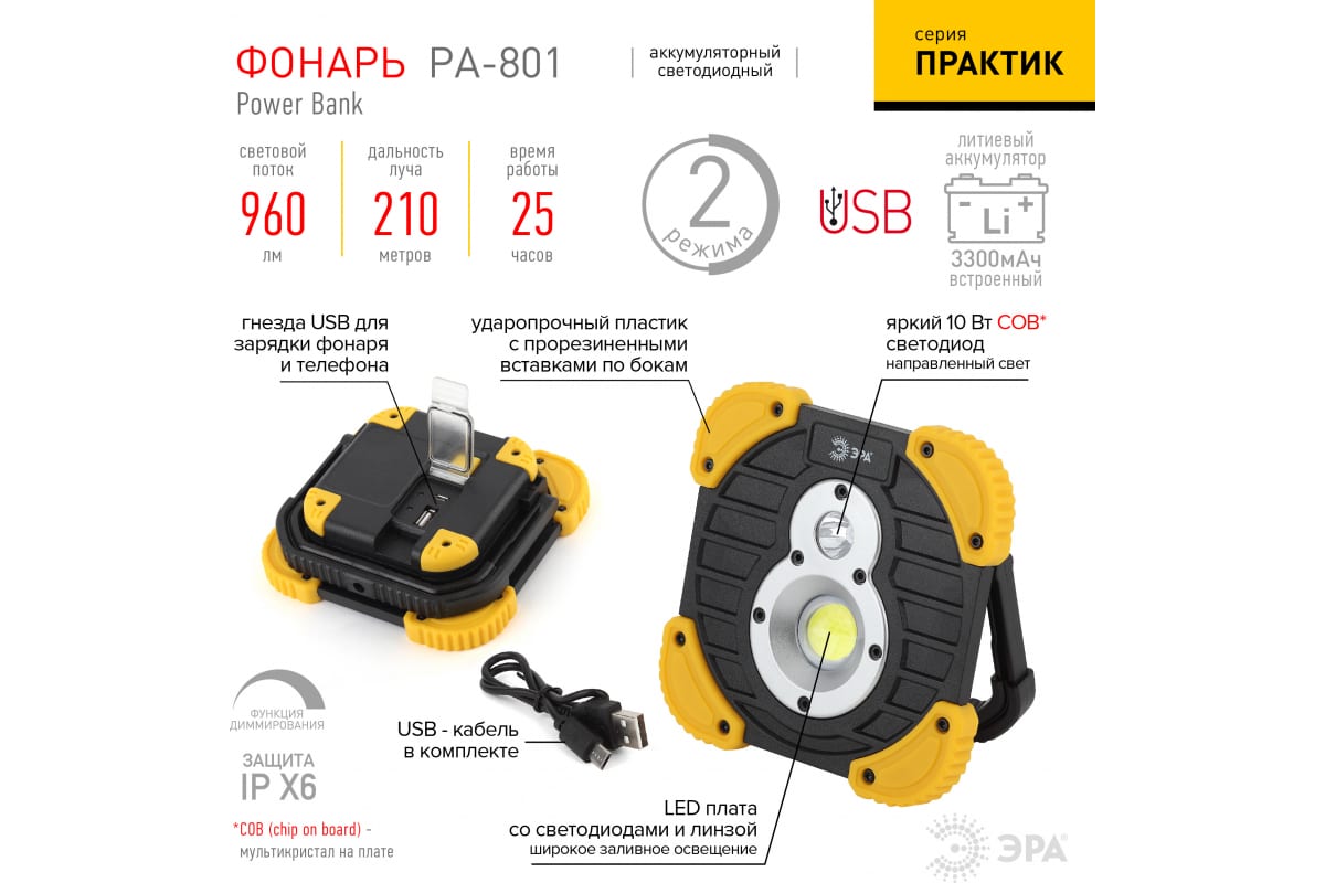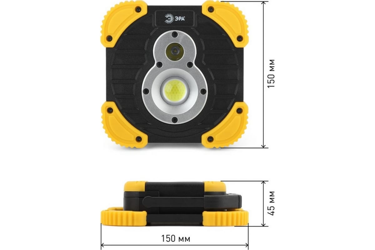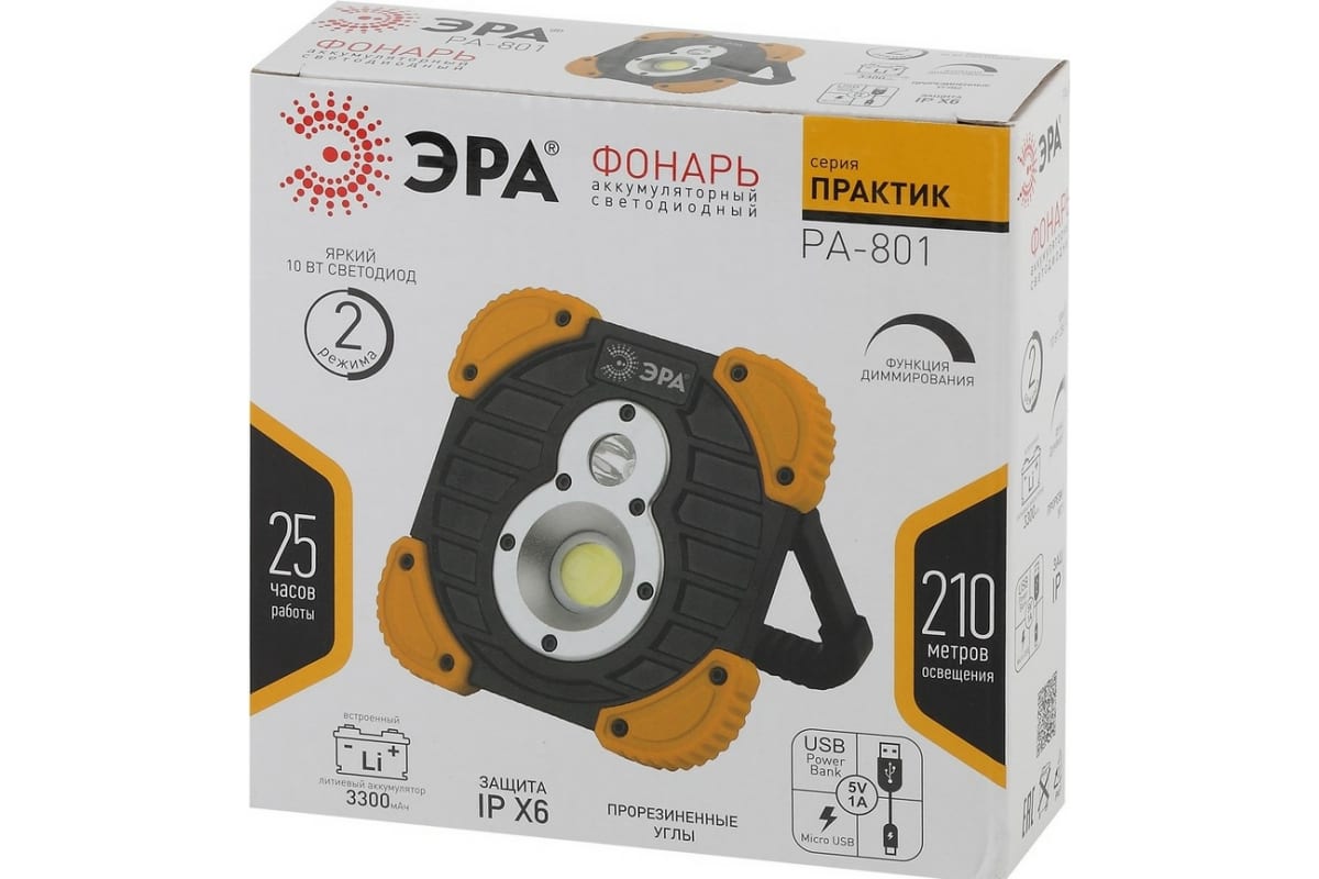 Фонарь-прожектор ЭРА PA-801 серия Практик 10Вт COB, 3,3 Ач, диммер, IPX6, PowerBank, коробка Б0036614 - идеальный выбор для тех, кому нужно всё и сразу. Светодиодный фонарь имеет размеры 15,5х15,5. Это экономит пространство и без труда позволяет брать фонарик в путешествие или на работу.