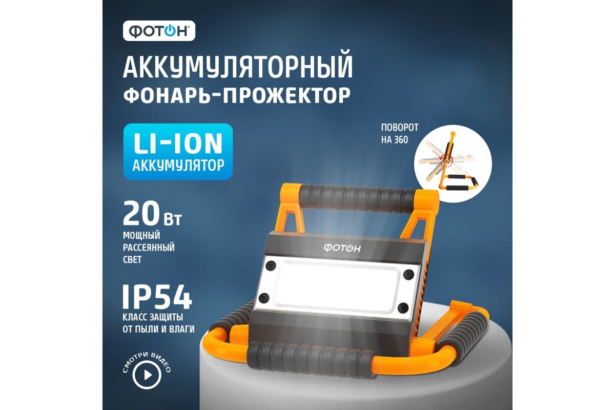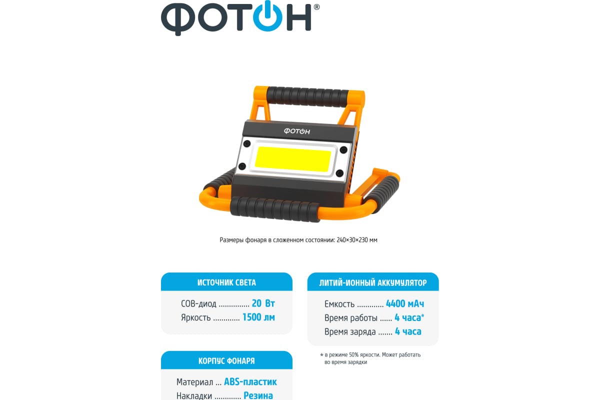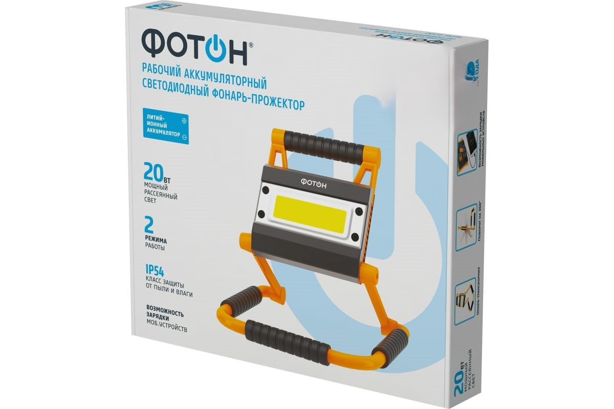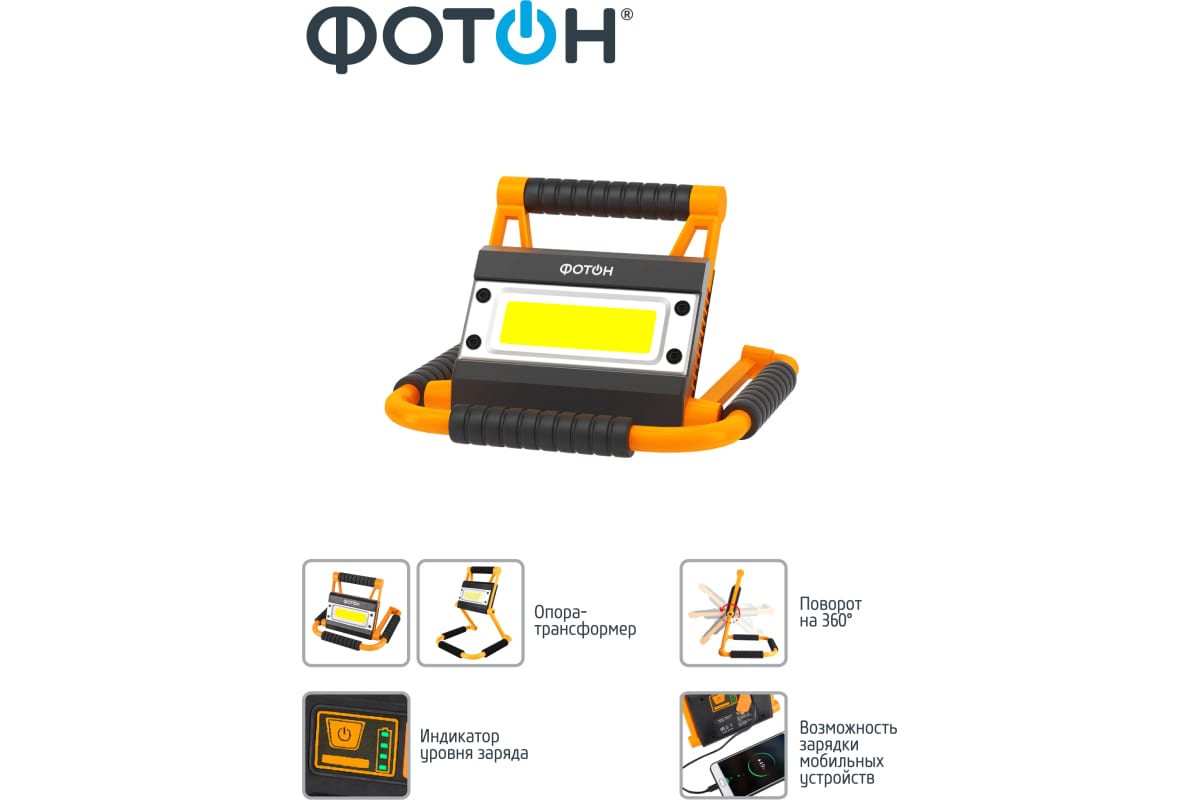 Рабочий аккумуляторный светодиодный фонарь-прожектор ФОТОН WPВ-6200 20W 24092 применяется на строительных площадках, при ремонтных или иных работах в больших помещениях или на улице. Компактный и функциональный фонарь-прожектор обладает качественным ярким освещением и отличается повышенной надежностью. Оборудован USB -портом для зарядки от фонаря мобильных устройств. Работает в двух режимах - 50% и 100% яркости. В режиме 50% яркости способен работать во время зарядки. Оснащен опорой-трансформером и может поворачиваться на 360 градусов. Время зарядки фонаря 4 часа.