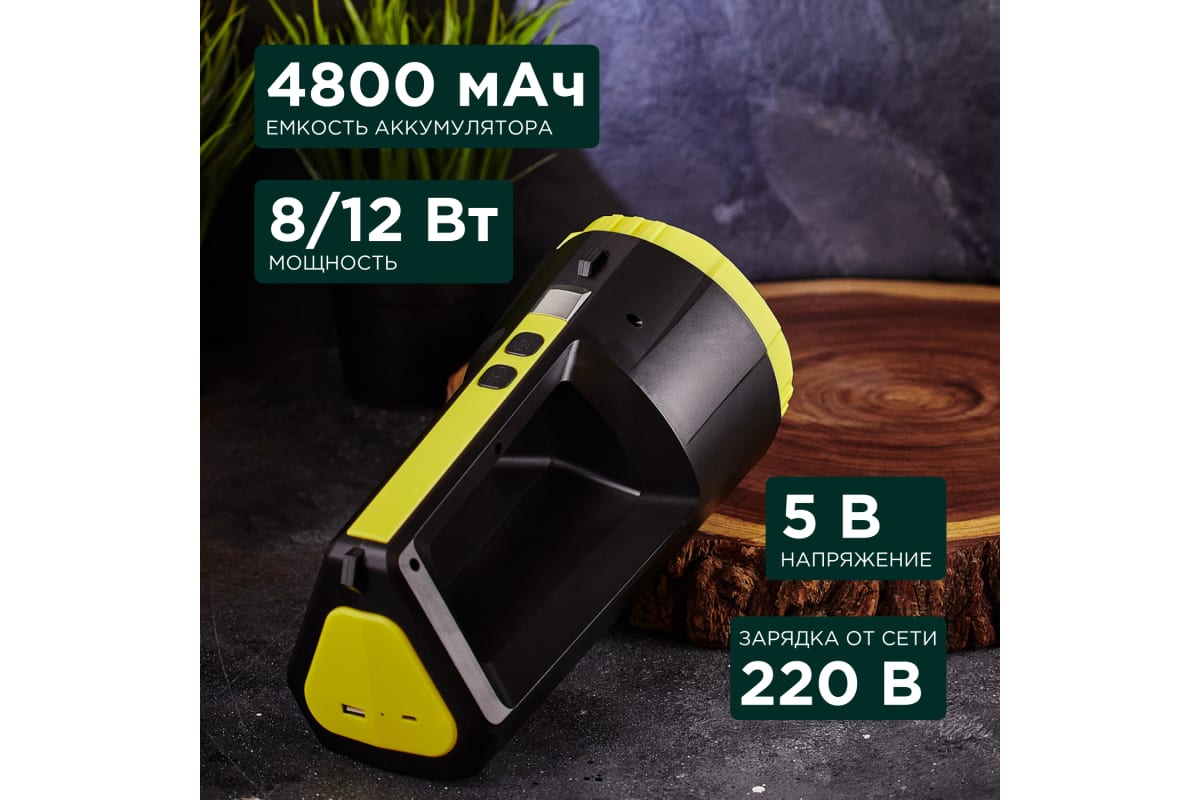 Благодаря емкому аккумулятору, фонарь может работать на протяжении 5 часов без подзарядки. Имеет мощный боковой свет от светодиода нового поколения, благодаря чему фонарь можно использовать не только во время кемпинга, но и при производстве работ в мастерских, гаражах, на рыбалке. В комплект входит удобный для переноски наплечный ремень.