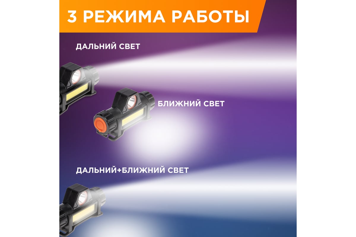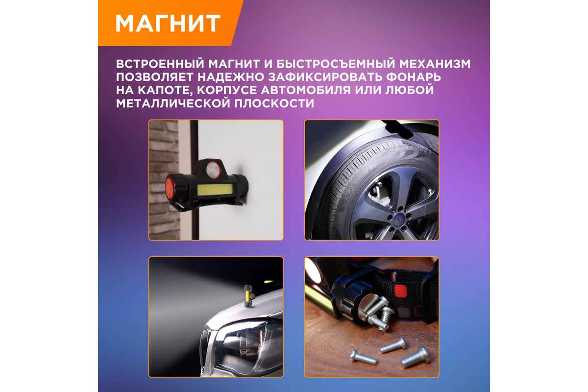 Налобный аккумуляторный поворотный фонарь REXANT с магнитом, дальний и ближний свет, li-ion, 75-7839 с быстросъемным механизмом используется как в качестве налобного, так и в качестве рабочего/автомобильного фонаря.