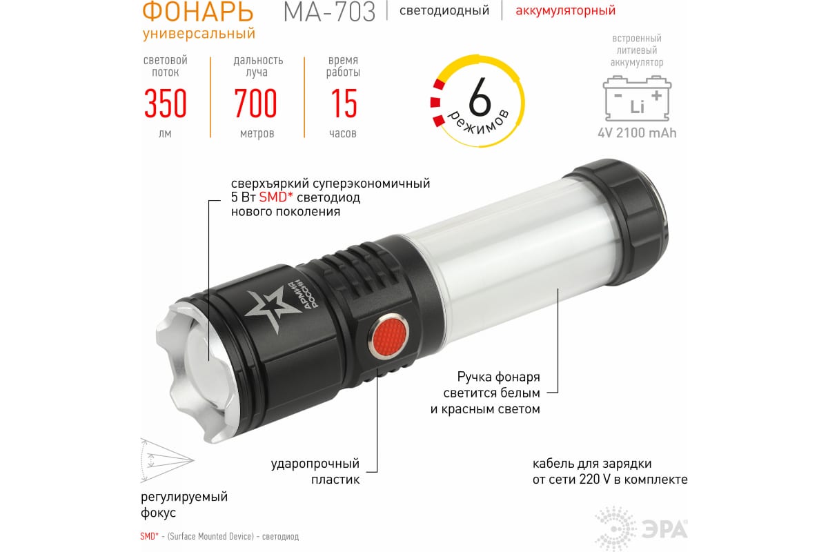 Технические характеристики ЭРА Тайфун MA-703 10Вт, 6 режимов, Li акб, магнит, крючок Б0052320