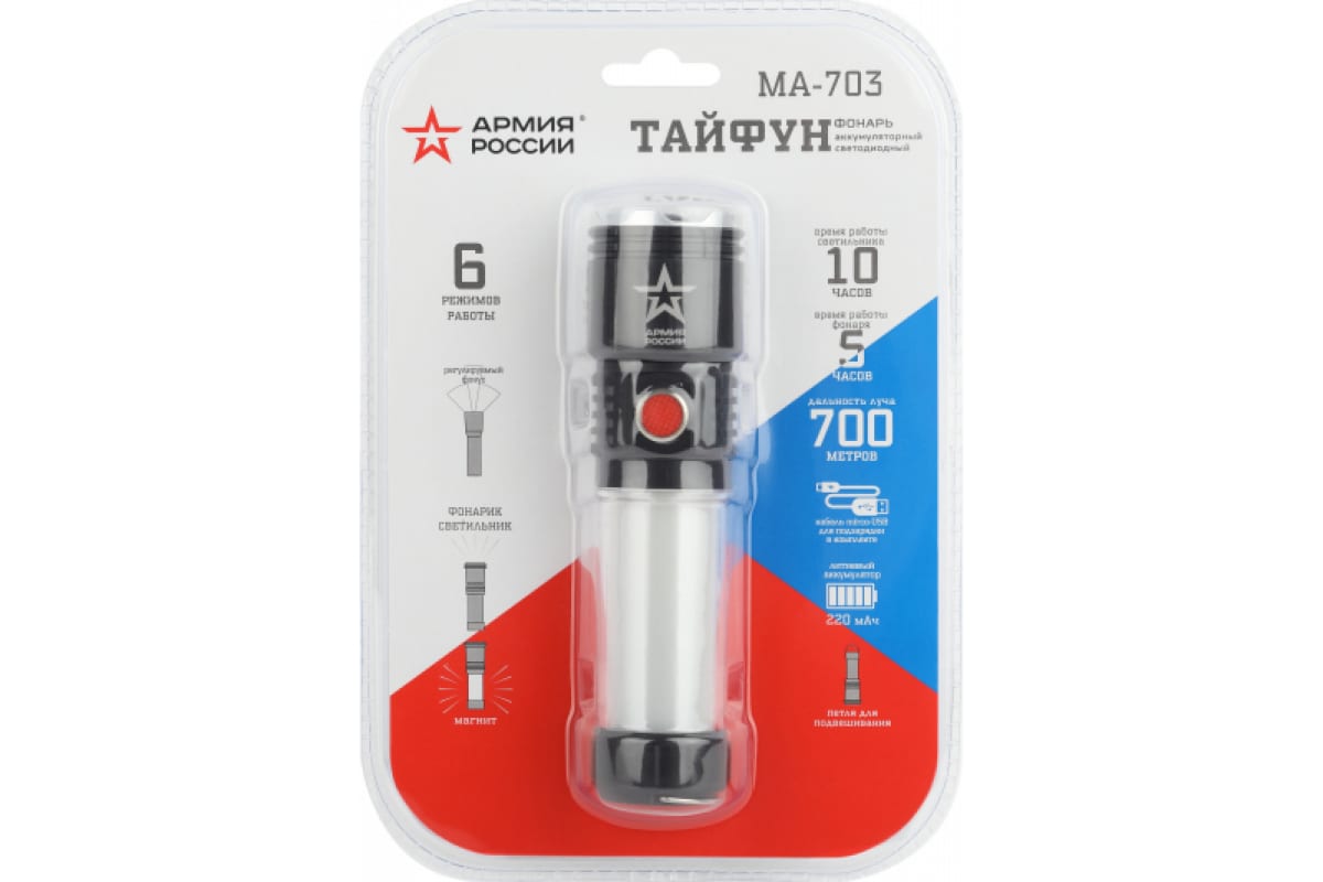 Светодиодный ручной аккумуляторный фонарь ЭРА АРМИЯ РОССИИ MA-703 Тайфун 10Вт 6 режимов Li аккумулятор магнит крючок Б0052320 - универсальный светодиодный аккумуляторный фонарь с лучом повышенной дальности, пятикратным зумом и встроенным светонакопителем. Его легко найти в темном помещении или в траве - после выключения сохраняет небольшое свечение.