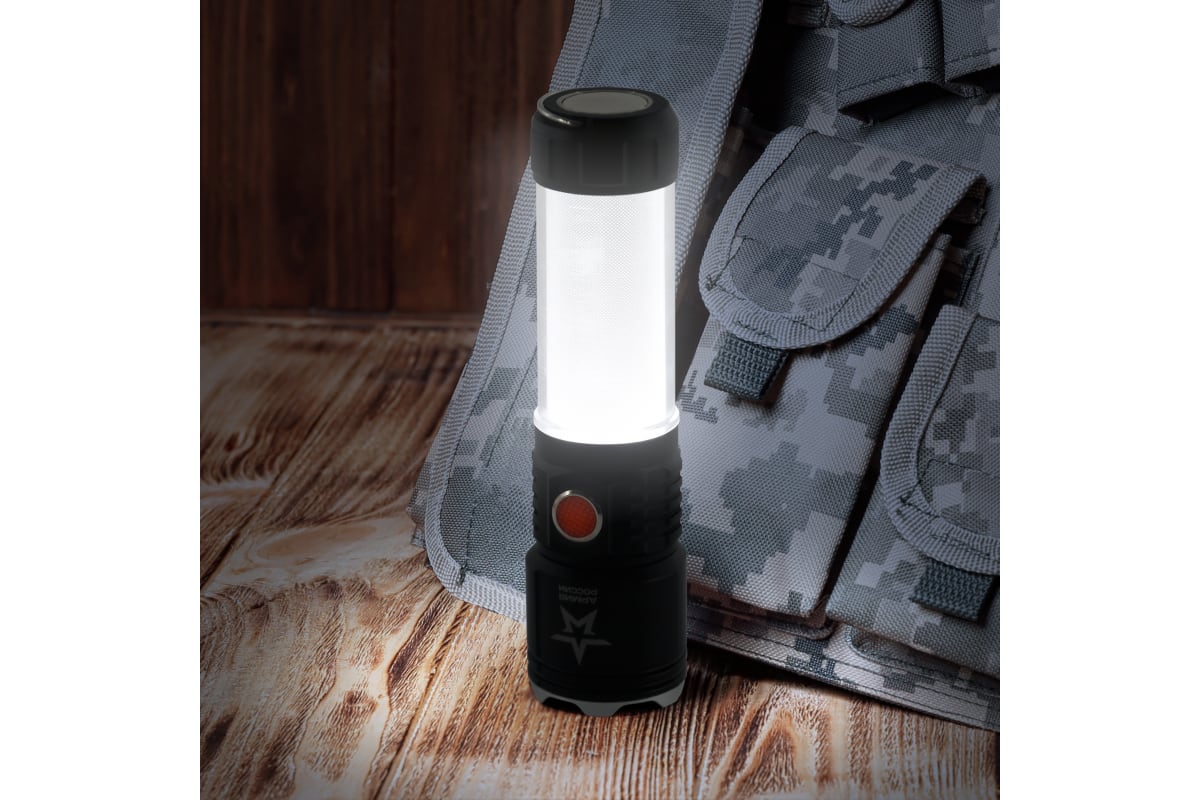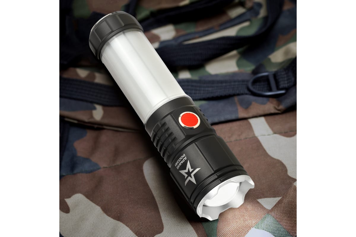 Армия России Тайфун выглядит отлично. Благодаря необычному фактурному дизайну корпуса и тщательной сборке его приятно держать в руках, а за счет продуманного функционала им приятно пользоваться. Фонарь украшает фирменная звезда Армии России - знак качества и особого статуса бренда. Аккуратная красная кнопка включения - дополнительный дизайнерский бонус.
