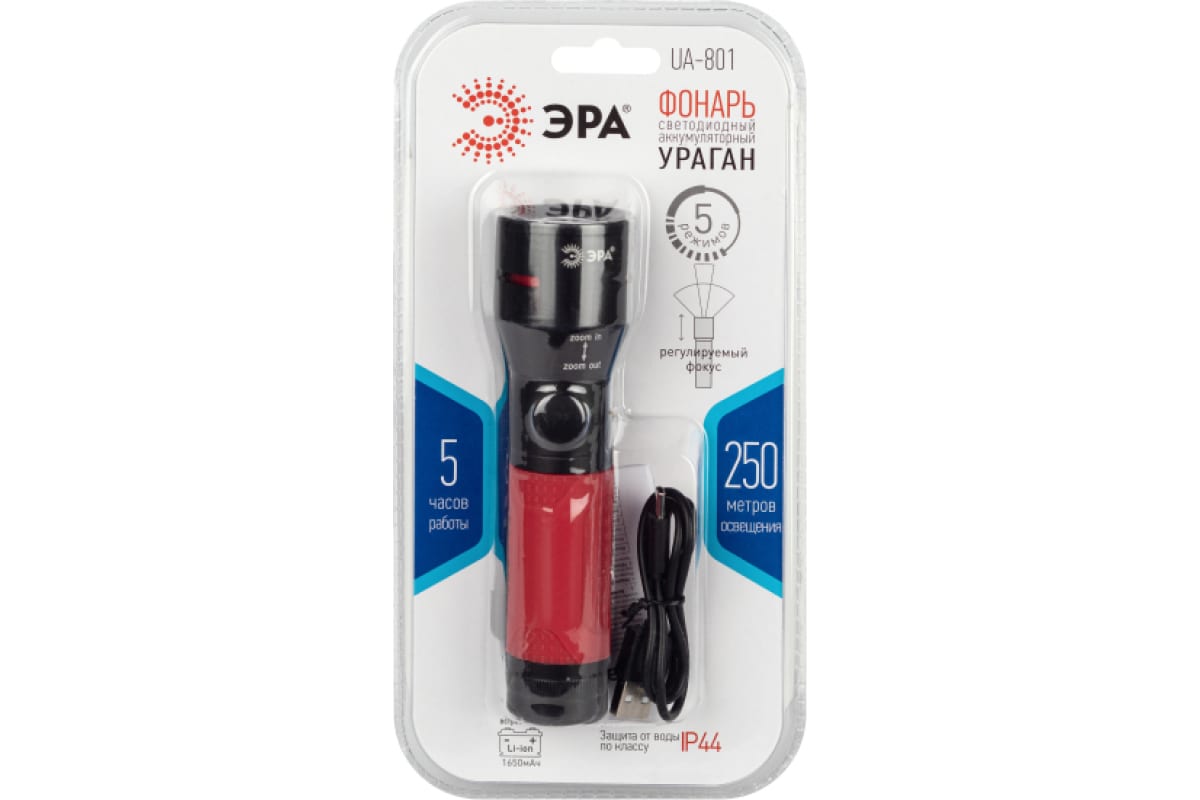 ЭРА UA-801 «Ураган» - мощный ручной аккумуляторный фонарь с высоким световым потоком (900 Лм) и дальним световым лучом (до 250 метров). Мощность этого светодиодного фонаря – 10 Вт. Несколько режимов работы (100% яркости, 50% яркости, 25% яркости, стробирование, SOS) делают этот светодиодный фонарь незаменимым помощником в работе, в быту, в загородном отдыхе. Аккумуляторный фонарь экономит средства на покупку батареек. Заряжается при помощи шнура Type-C в среднем за 3 часа. От одной полной подзарядки работает без перерыва до 5 часов. Регулировка фокусировки луча позволяет создать широкий заливающий свет или ярко подсветить конкретный объект. Защита от влаги и пыли (IP44) даёт возможность использовать данный светодиодный фонарь в экстремальных условиях. Сверхъяркий, суперэкономичный светодиод. Не требует обслуживания и замены на протяжении всего срока службы фонаря.