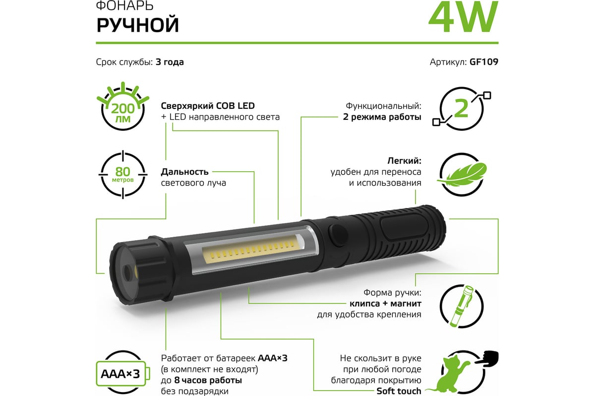 Технические характеристики Gauss GFL109 4W 200lm 3xAAA LED GF109