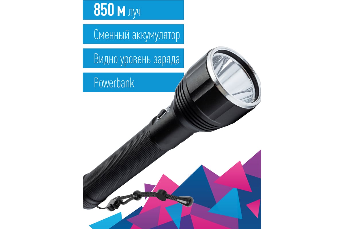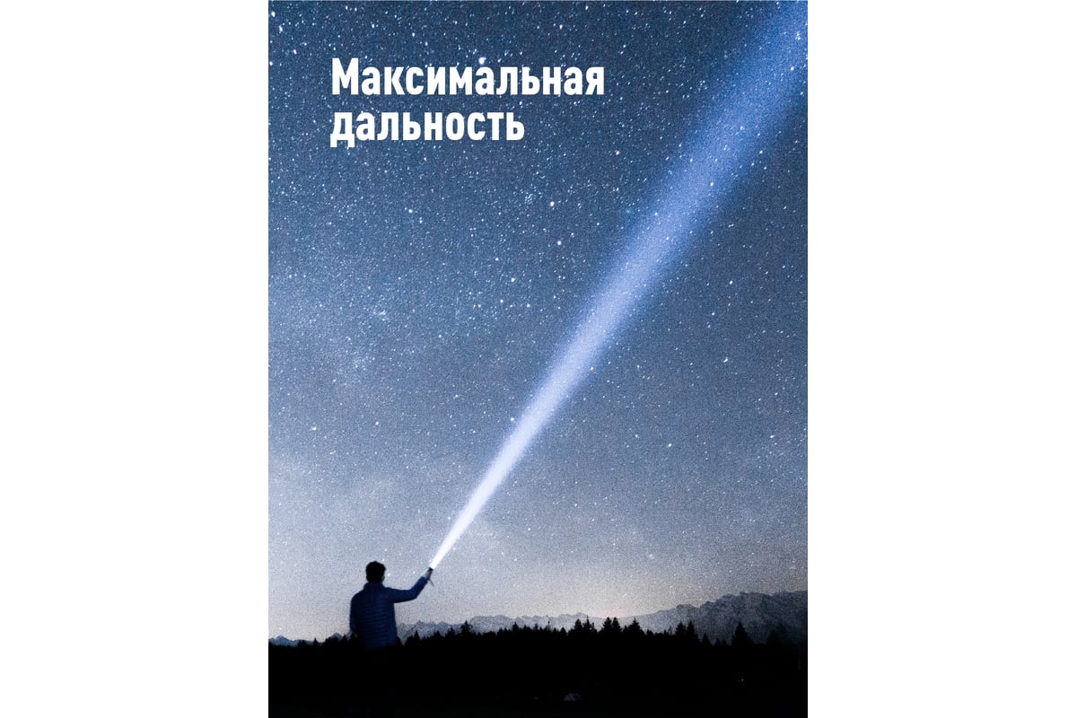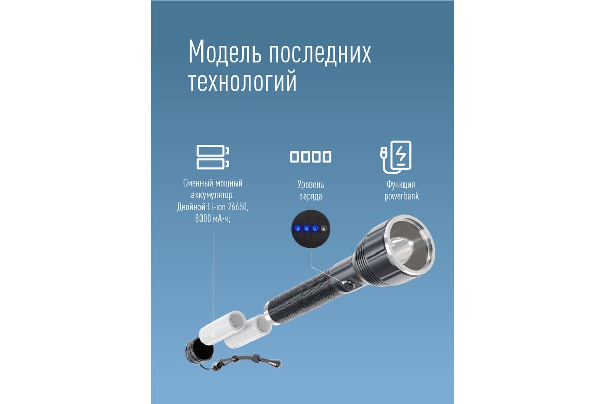 В корпусе 2 сменных сверхмощных литиевых аккумулятора 26650×2 на 8000 мА/ч. Полностью металлический корпус защищён от дождя и имеет умный индикатор, отображающий уровень заряда в процессе использования. А powerbank-выход зарядит мобильные устройства.