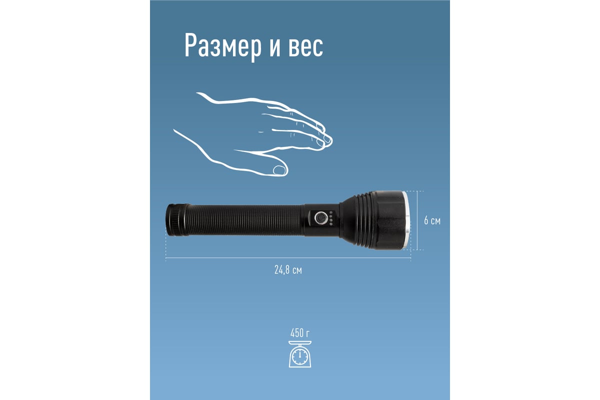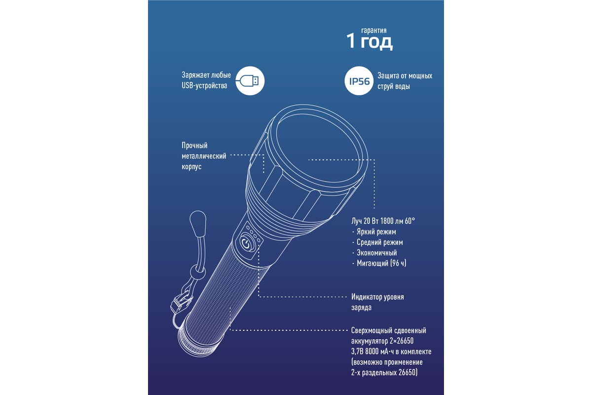 Источник света: 20Вт LED; Источник питания: съемные Li-ion аккумуляторы 26650 3,7В 4000 мА/ч x 2 шт. = 8000 мА/ч (входят в комплект), индикатор уровня заряда, зарядный USB-шнур type C в комплекте, функция power bank.