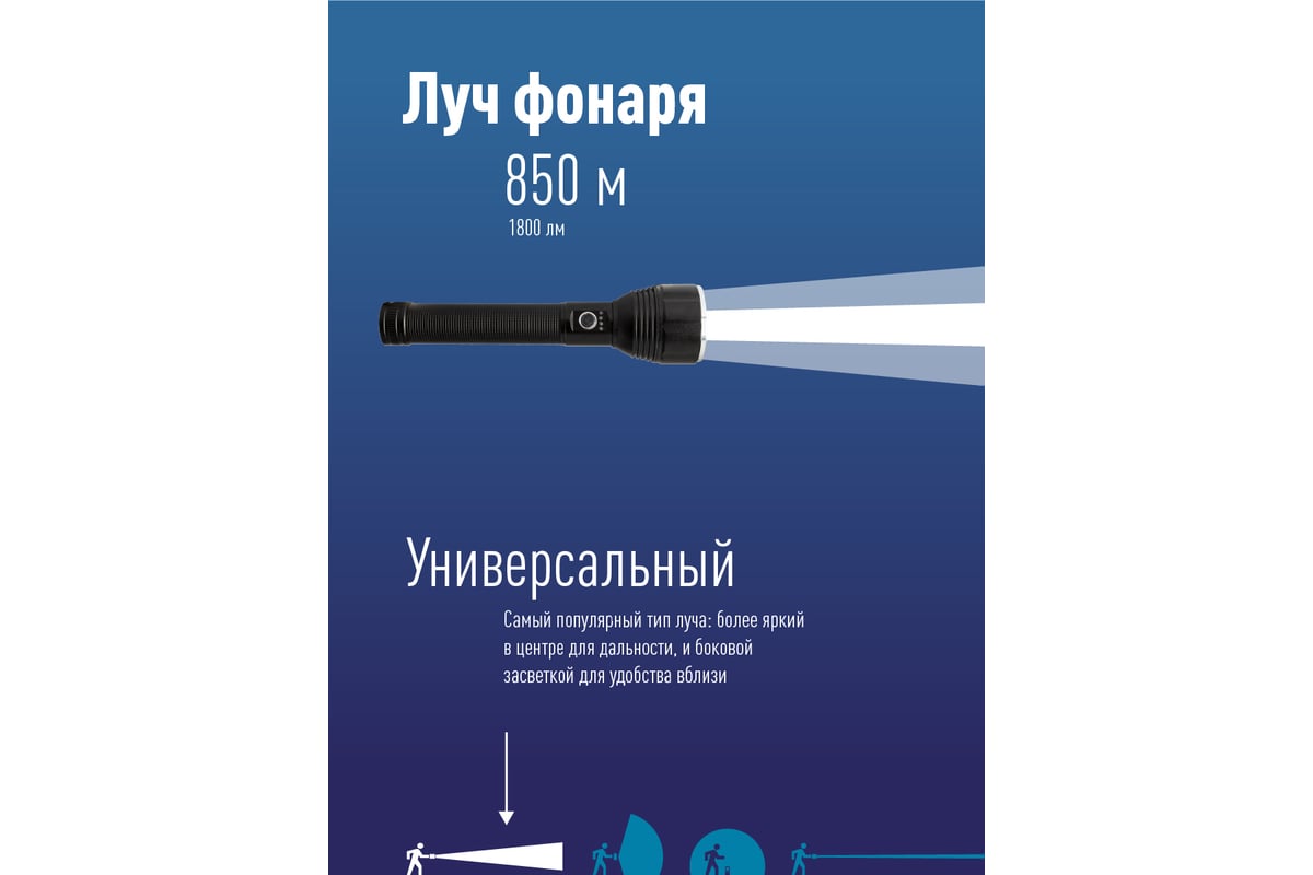 Фонарь ручной КОСМОС (KOC131Lit) имеет луч мощностью 20 Ватт - это 1800 люмен, что сопоставимо с мощностью сразу 4-5 прожекторных фонарей.