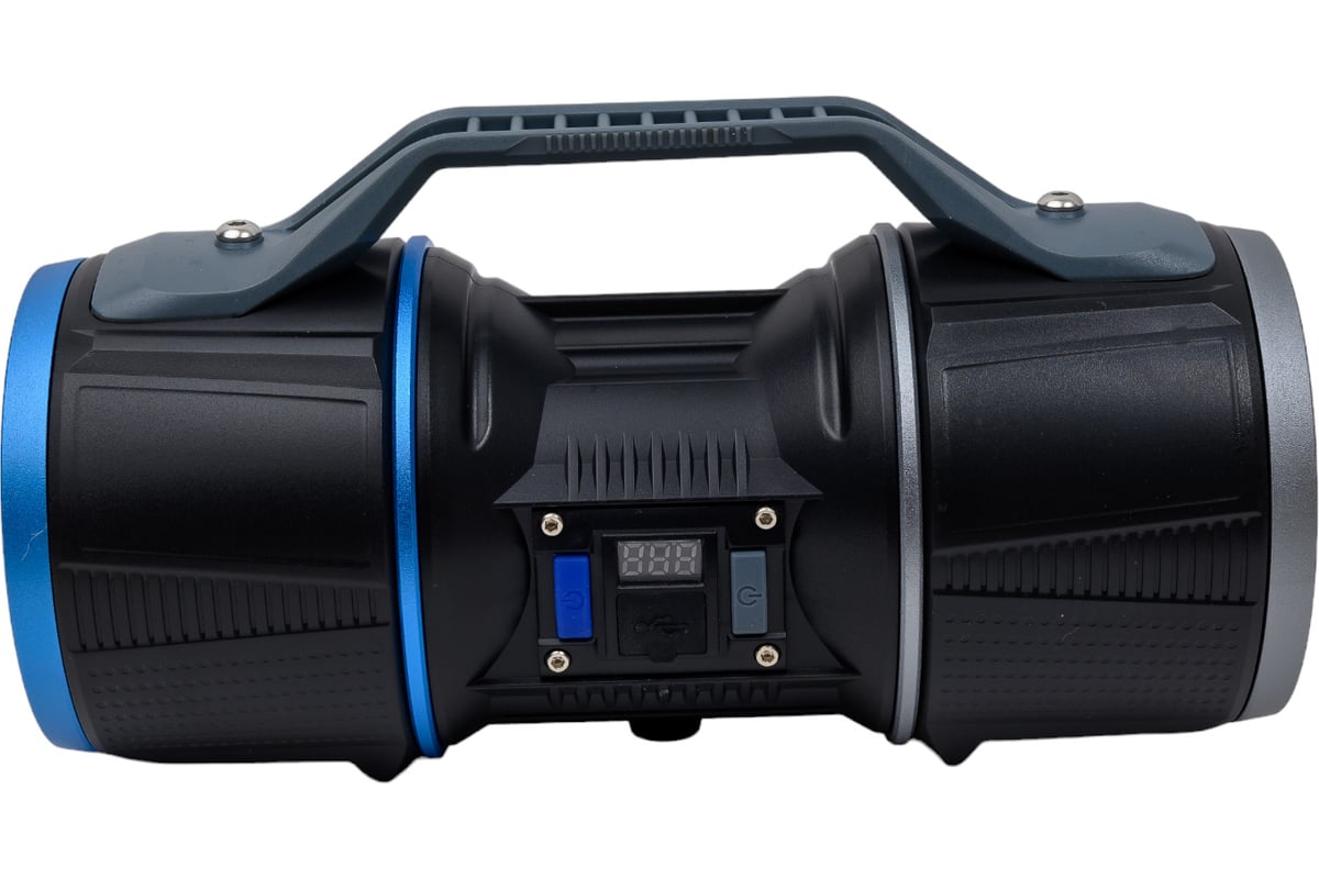 Фонарь прожектор ручной КОСМОС (KOC901Lit) - у этого фонаря обе стороны передние, как ни крути. Два мощных фонаря - классический луч на 10 Вт и широкий свет на 12 Вт. Каждый фонарь имеет свой выключатель. Подходит как для бытовых нужд, так и для профессионалов, т.к. снизу есть стандартное гнездо для штативов (съемка, или технические), что оценят как видеографы, так и монтажные бригады.