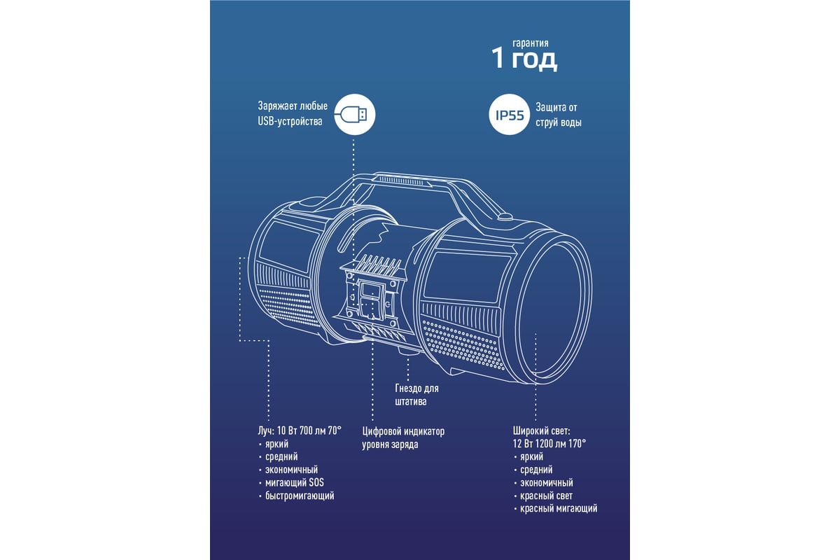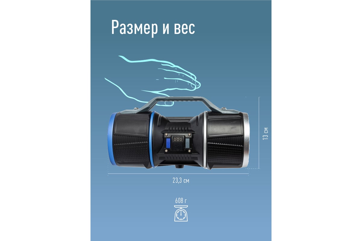 Источник широкого света может стать сигнальным: благодаря режиму красного и красного мигающего. Гнездо powerbank сможет подзарядить мобильное устройство. Уровень заряда батареи отображается на цифровом дисплее.