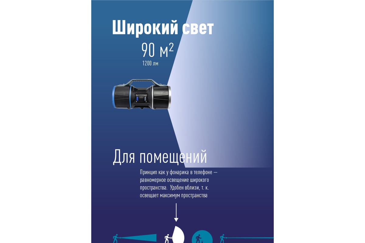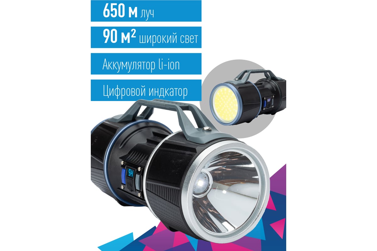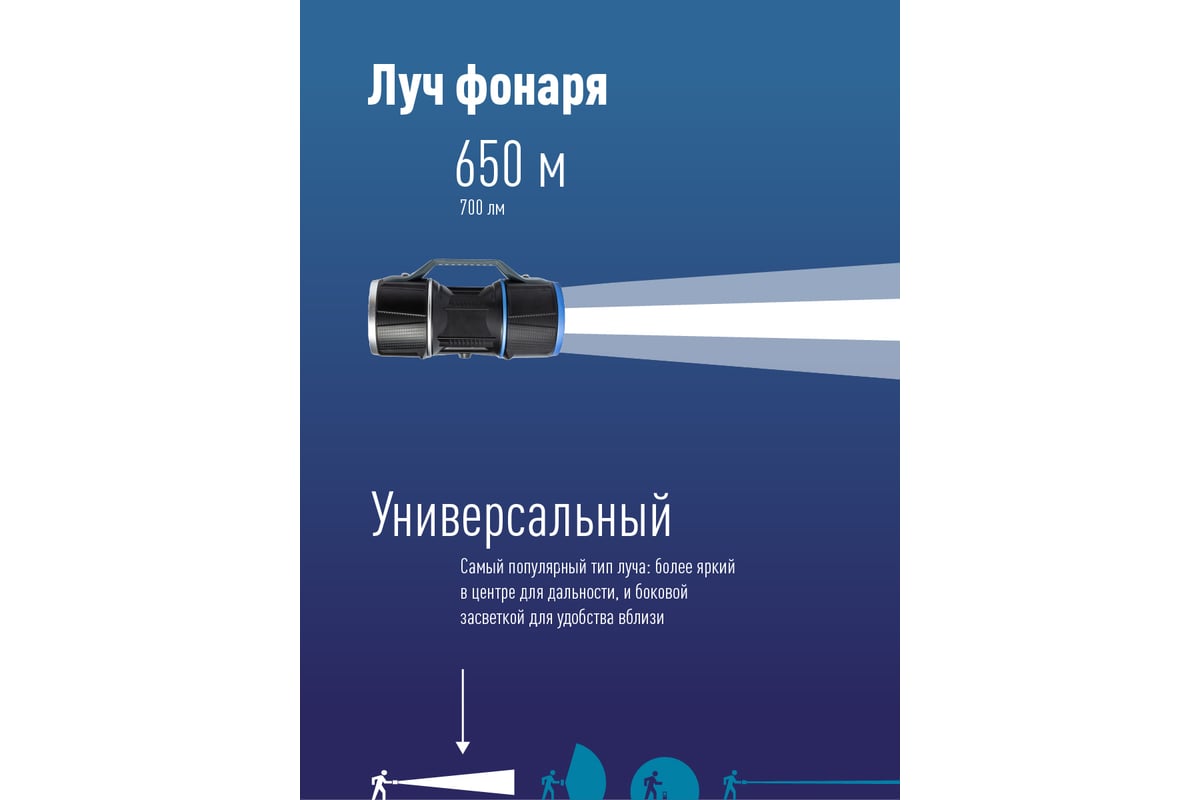 -Дистанция освещения: 650 м. (луч)/90м2 (широкий свет).