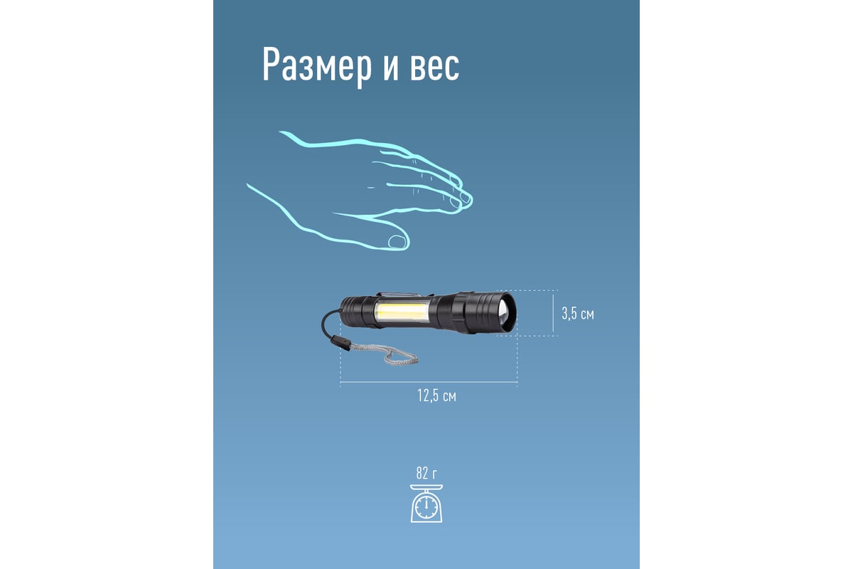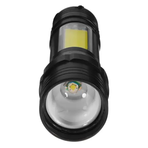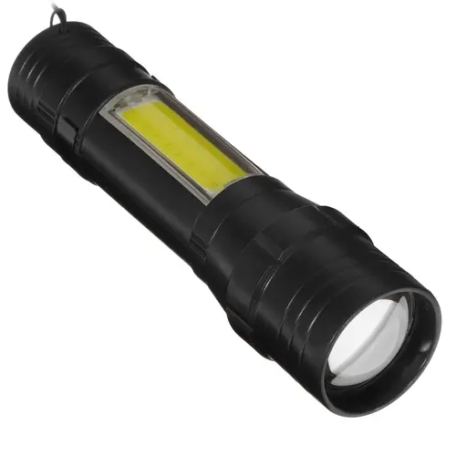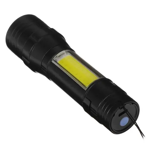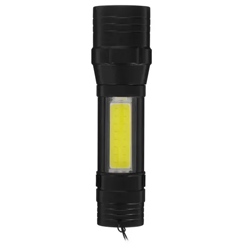 Ручной аккумуляторный фонарь КОСМОС 1Вт LED+5ВтCOB/линза/зум/Li-ion 18650 1000mAh/ABS-пластик/USB-шнур, KOS113Lit с комбинированным светом. Совмещает дальний узконаправленный луч (оптика позволяет настроить ширину луча) и широкий свет (освещает широкое пространство с одной стороны). Источник питания: Li-ion аккумулятор 18650 3,7В 1000 мА/ч (встроенный).
