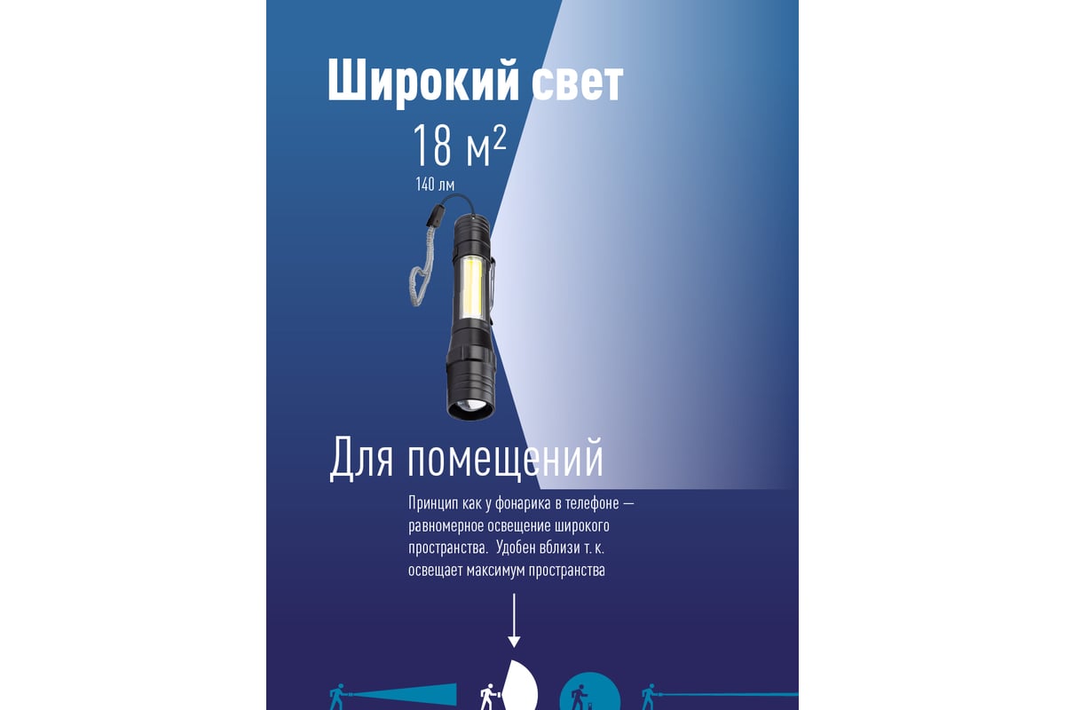 6.Дистанция освещения: 115 м. (луч)/18м2 (широкий свет, боковой светильник).