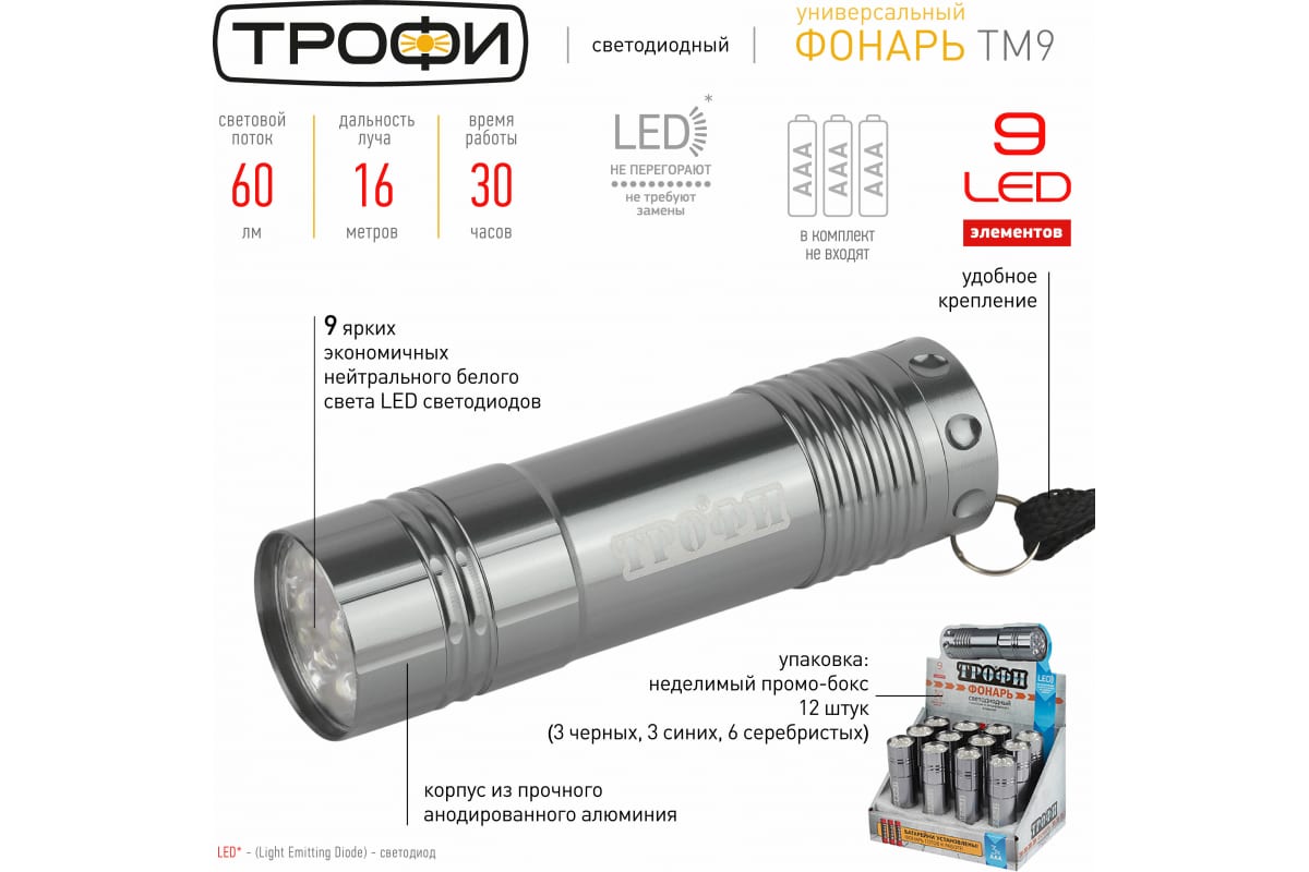 Светодиодный фонарь ТРОФИ TM9 ручной на батарейках алюминиевый Б0004986 - компактный и простой в управлении LED-фонарь с 9 белыми светодиодами и корпусом из прочного анодированного алюминия. От одного комплекта алкалиновых батареек непрерывно работает 30 часов. Лаконичный дизайн. Металлический карманный фонарик для самых разных целей. Всегда под рукой, когда нужно что-то оперативно подсветить. В комплекте мягкий прочный ремешок для удобной переноски фонаря на запястье. Корпус изготовлен из анодированного алюминия. Это прочный материал, устойчивый к возникновению царапин и сколов при возможных падениях и ударах. Трофи ТМ9 прослужит долго и сохранит свой приятный внешний вид даже спустя годы использования. Яркий ровный свет обеспечивают 9 современных белых светодиодов. Они не перегорают, не тускнеют со временем и не нуждаются в замене. При этом очень экономичны - от одного комплекта алкалиновых батареек (3хААА) фонарь непрерывно работает 30 часов!