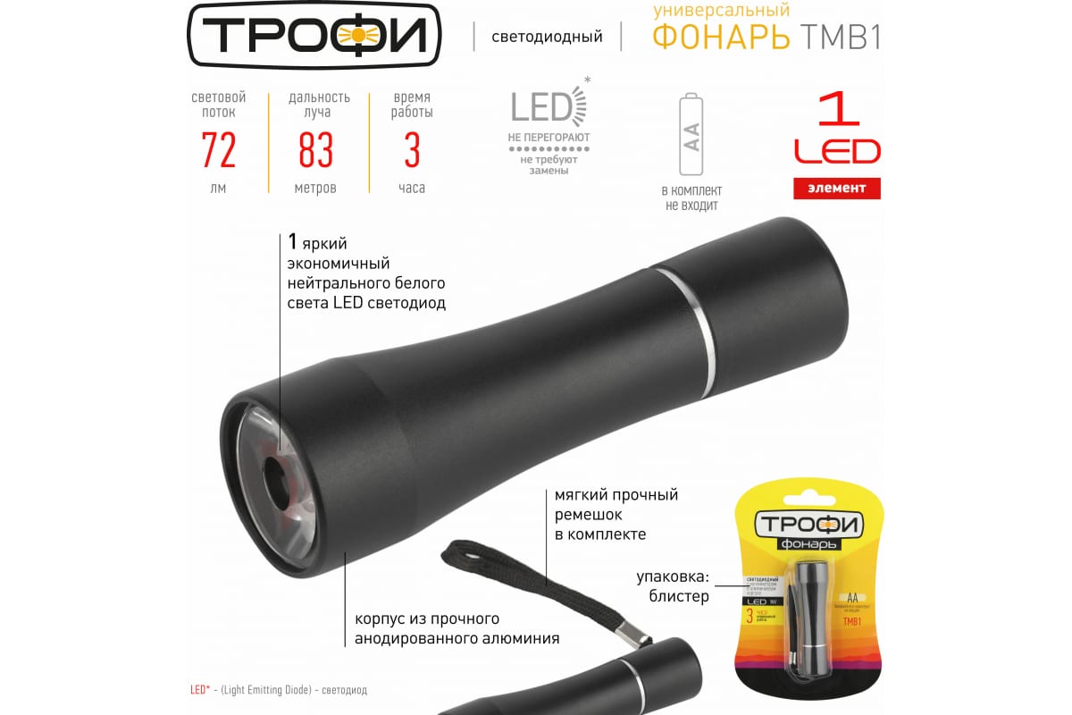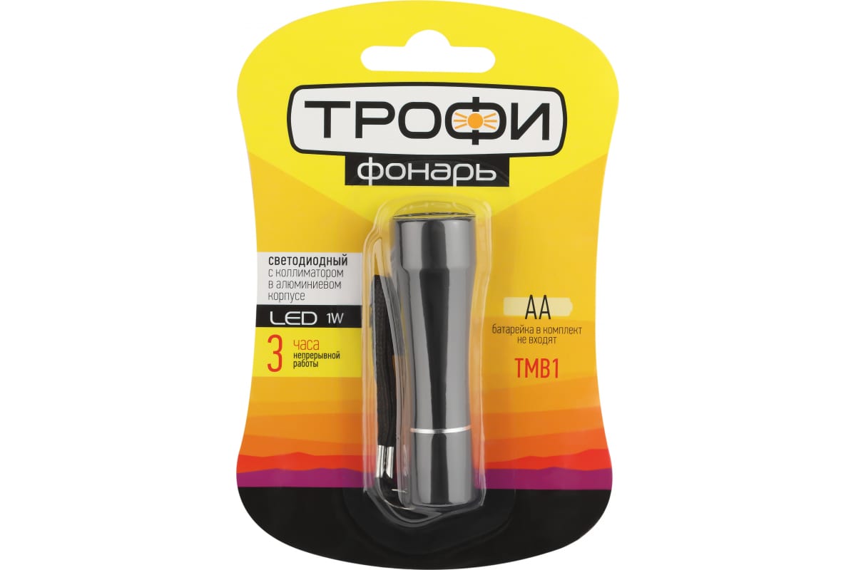 Светодиодный ручной фонарь ТРОФИ TMB1 на батарейках 1x1W LED алюминий, 1хАА, коллиматор Б0023318 - компактный фонарь с колимматором и металлическим корпусом. В комплекте мягкий прочный ремешок для переноса на запястье. Светит ярко и имеет повышенную дальность светового луча.