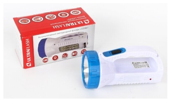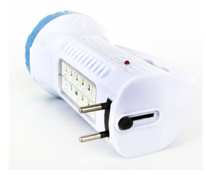 Фонарь Ultraflash электрический светодиодный аккумуляторный. Цвет корпуса: белый + синий. Материал корпуса - пластик. Источник света - 1 светодиодов мощностью 1 Ватт со световым потоком 75 люмен - в отражателе, 12 светодиодов типа SMD - в плафоне. Дистанция освещения - до 200 метров. Два режима работы. Выключатель - тумблер двухпозиционный. Время работы при полностью заряженном аккумуляторе: 1 светодиод - до 2,5 ч, 12 светодиодов в плафоне - до 2 ч. Время заряда 4 ч. Комплектация: фонарь, свинцово-кислотный аккумулятор с напряжением 4 В емкостью 0,7 А-ч, светодиодный индикатор заряда, ремень для переноски, инструкция, упаковка. Степень пыле-влаго-защиты IP22. Упаковка - коробка. Максимальный линейный размер фонаря 15,2 см. Размер упаковки 7,8 см x 15,8 см x 7,8 см. Вес без упаковки 0,178 кг. Вес с упаковкой 0,230 кг.