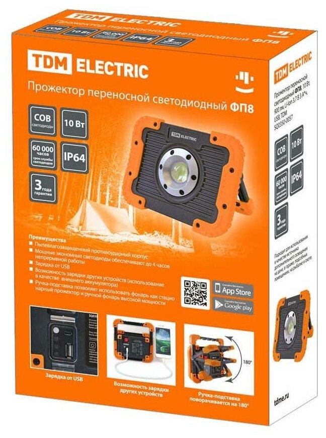 Технические характеристики TDM ФП8 10 Вт, 900 лм, Li-Ion 3,7 B 3 Aч, USB, SQ0350-0057