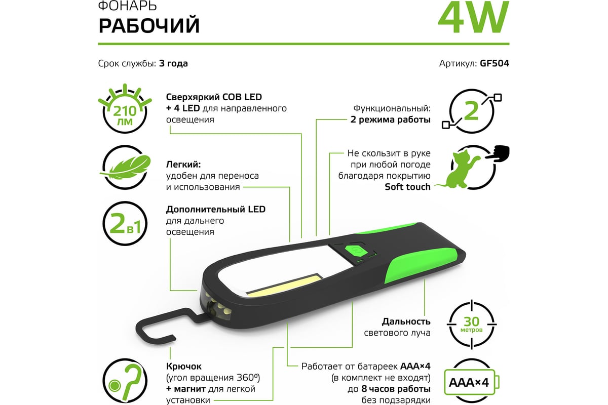 Рабочий фонарь GAUSS модель GFL504 4W 210lm 4xAAA LED1/12/48 GF504 - это подходящие решение, которое поможет подсветить даже труднодоступное пространство во время ремонтных работ дома, на даче, мастерской. Используется современный li-ion аккумулятор, способный поддерживать длительное автономное освещение и проводить его зарядку от штатного USB разъема в автомобиле или ноутбука. Прочная конструкция и мощный световой поток позволит с уверенностью решить любые задачи по освещению и обеспечит длительную службу.