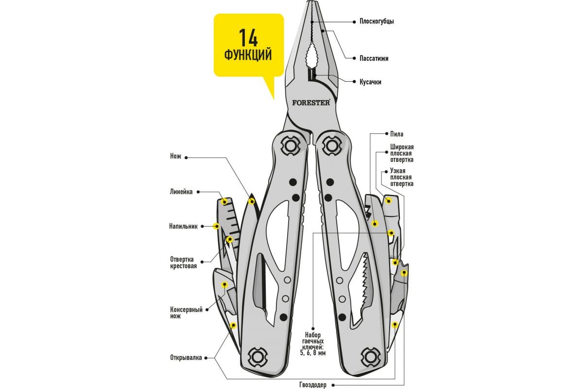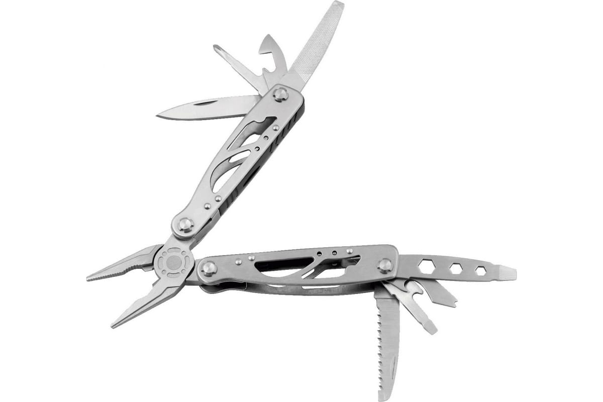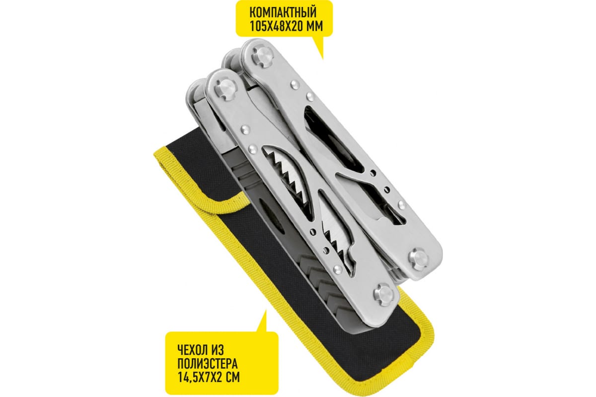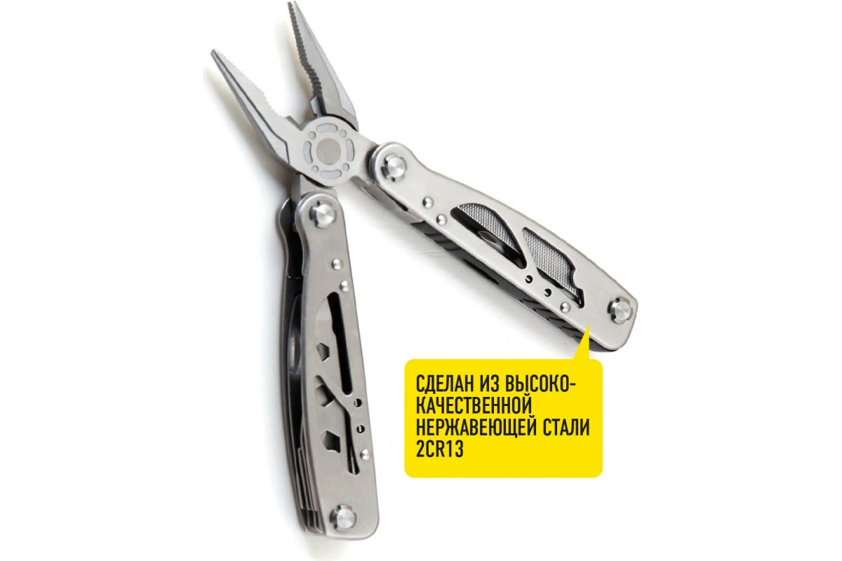Многофункциональный инструмент, который включает 14 функций: плоскогубцы; пассатижи; кусачки для проволоки; нож; отвертка крестовая; напильник; линейка; консервный нож; пила; узкая плоская отвертка; открывалка для бутылки; гвоздодер; широкая плоская отвертка; набор гаечных ключей: 5, 6, 8 мм.