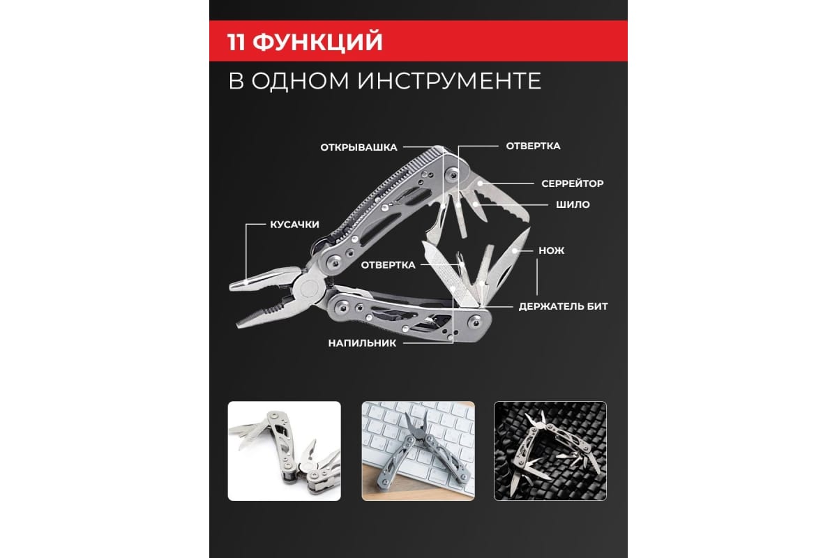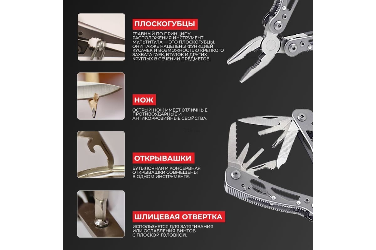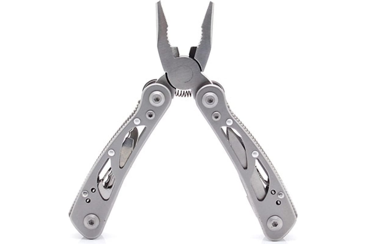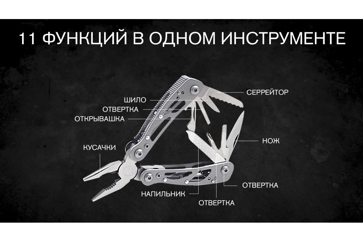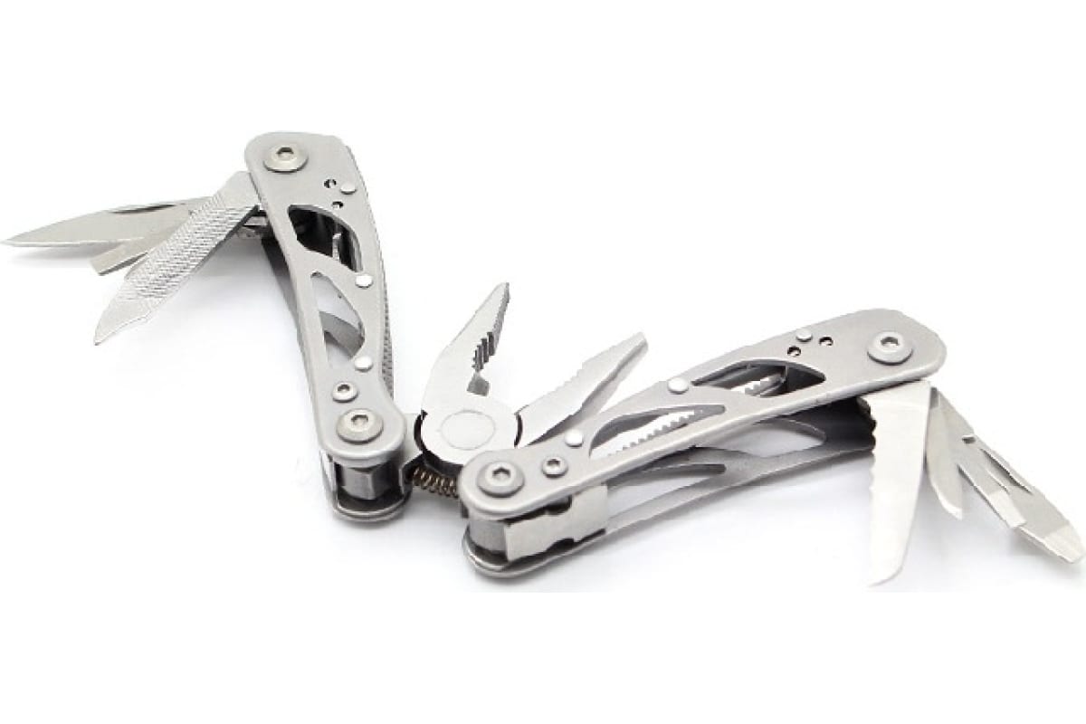 плоскогубцы,кусачки,средняя отвертка плоская,маленькая отвертка плоская,крестообразная отвертка,нож,серрейтор,открывалка для бутылок,для снятия изоляции,шило,пилочка для ногтей