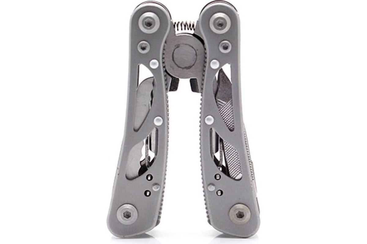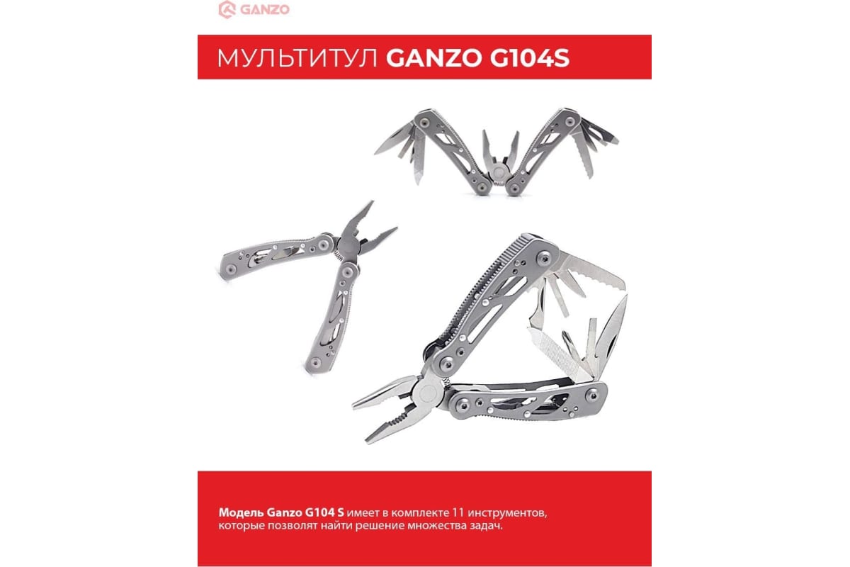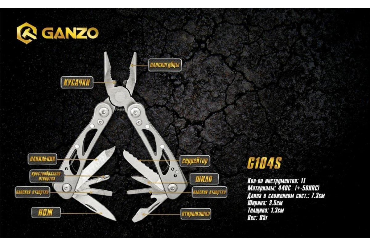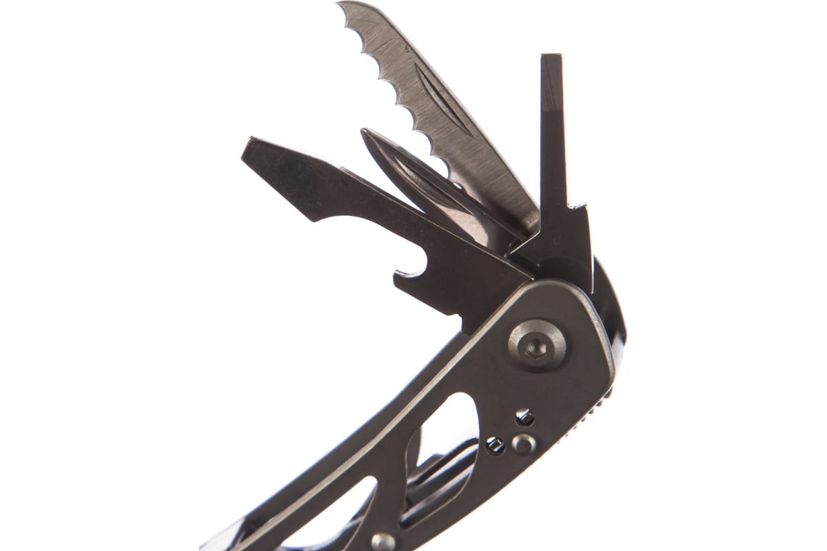 В комплект мультитула G104 S входят следующие инструменты: подпружиненные плоскогубцы с кусачками, два лезвия, одно из которых имеет серрейторную заточку, две плоских и одна крестообразная отвертки среднего размера, шило, небольшой напильник, паз для снятия изоляции с проводов, открывалка для бутылок и консервный нож. Все инструменты выполнены из нержавеющей стали 440С, которая имеет высокие эксплуатационные характеристики.