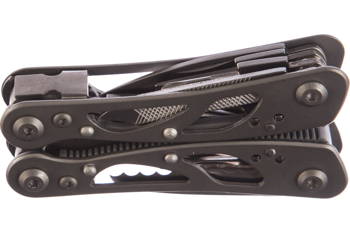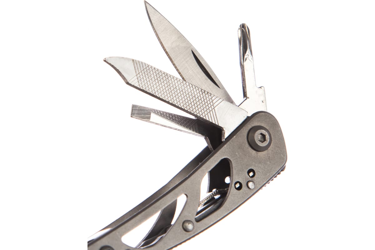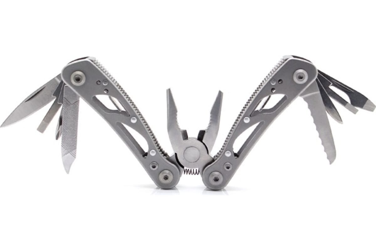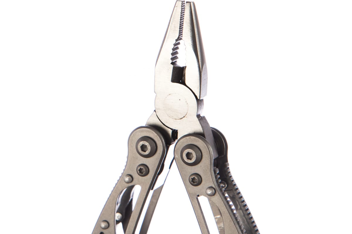 В комплект мультитула G104 S входят следующие инструменты: подпружиненные плоскогубцы с кусачками, два лезвия, одно из которых имеет серрейторную заточку, две плоских и одна крестообразная отвертки среднего размера, шило, небольшой напильник, паз для снятия изоляции с проводов, открывалка для бутылок и консервный нож. Все инструменты выполнены из нержавеющей стали 440С, которая имеет высокие эксплуатационные характеристики.