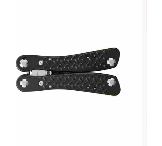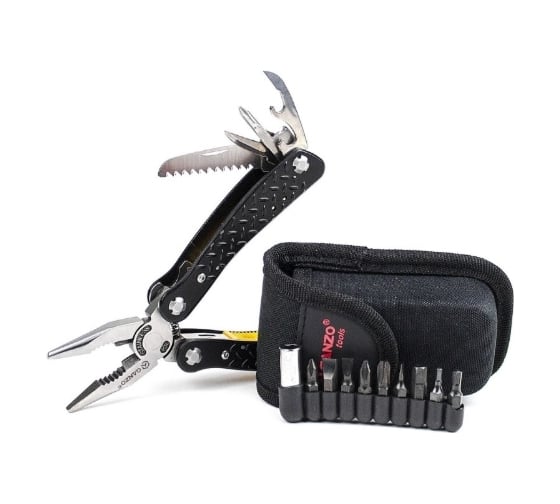 лезвие с прямой заточкой, серрейтор, две плоские отвертки, напильник, шило, открывалка для бутылок, консервный нож, держатель для бит