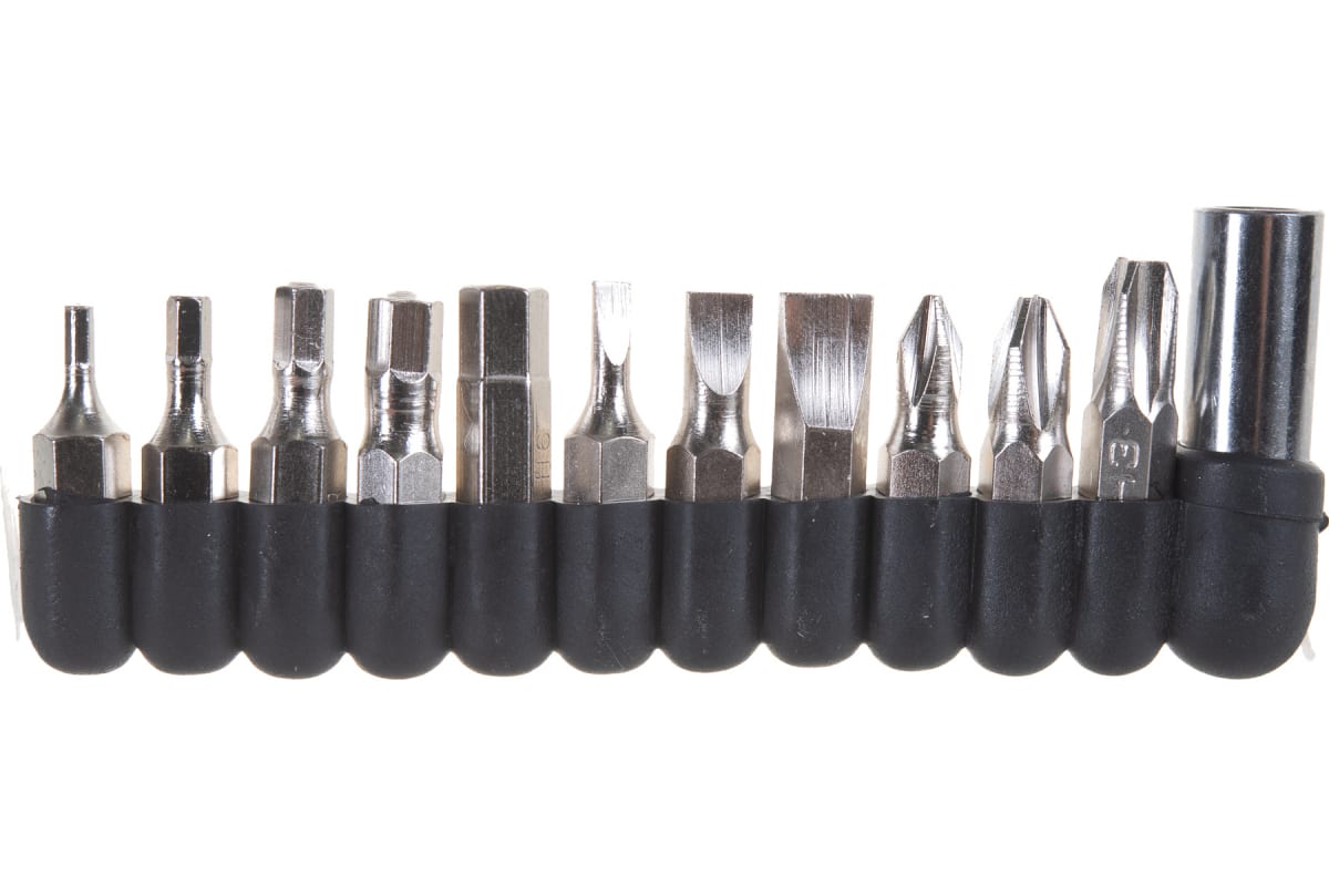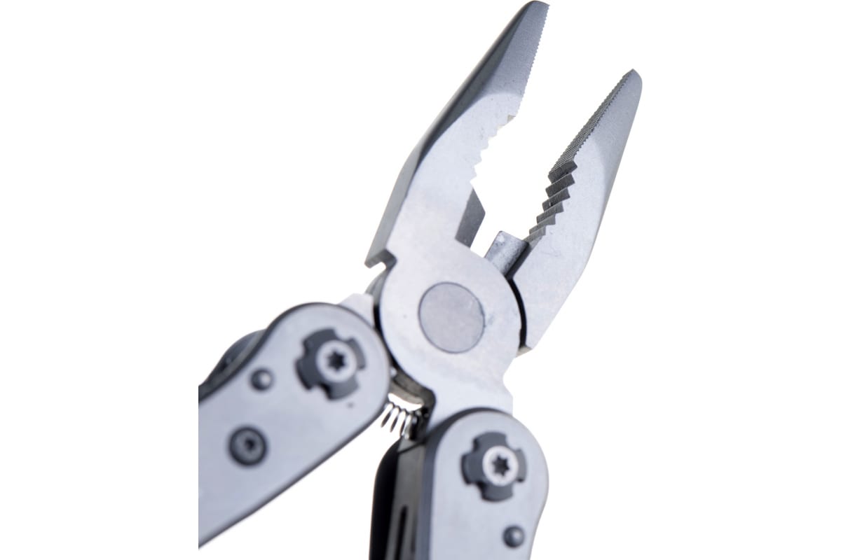 Плоскогубцы,кусачки,пила,нож с прямой заточкой,нож с серрейторной заточкой,ножницы,две шлицевые отвертки разного размера,открывалка для бутылок и консервов,держатель для съемных отверток,магнитный переходник,набор бит.