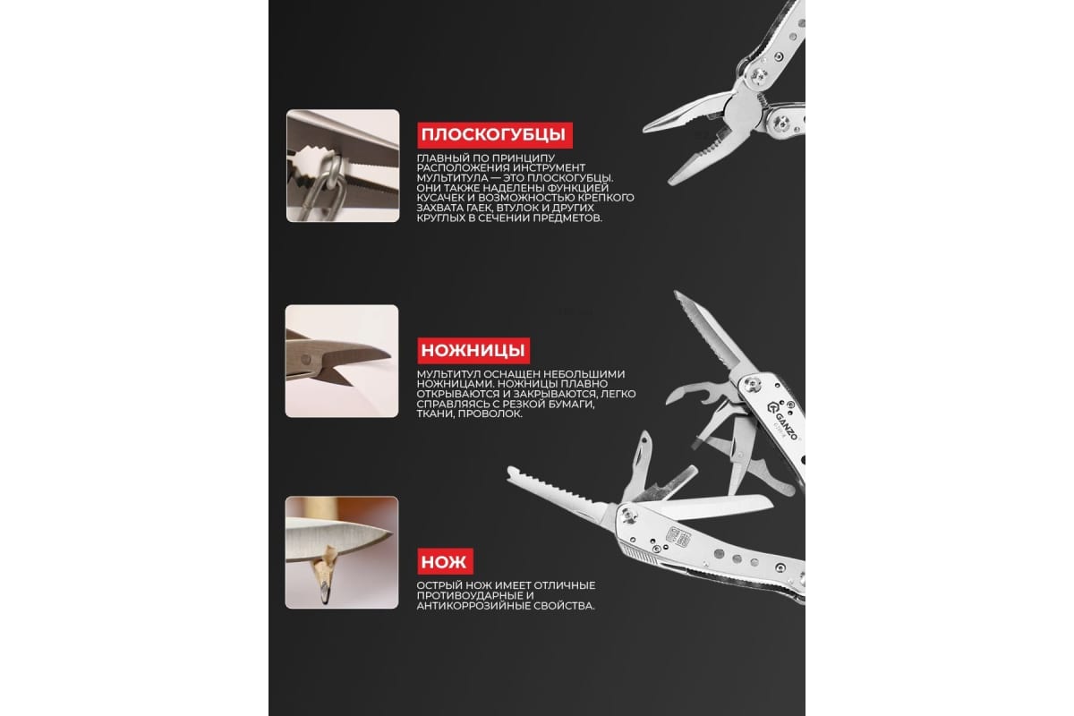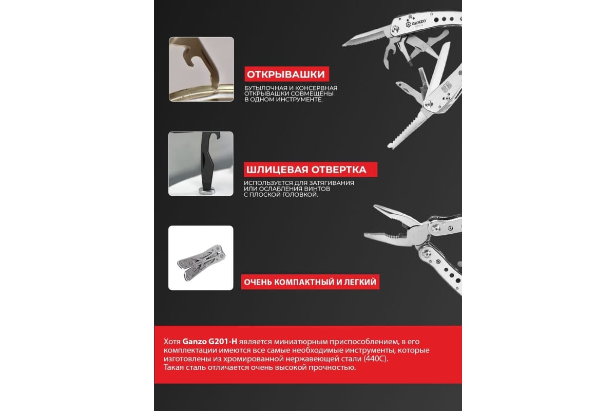 Мультитул Ganzo G201 представляет из себя практичный инструмент для ремонта любого снаряжения или даже техники в походных условиях. Он довольно компактный и легкий (265 грамм), чтобы его было удобно брать с собою в поездки. В то же время, Ganzo G201 успешно справляется с 22 различными функциями.