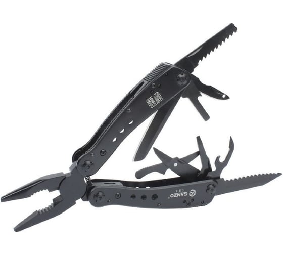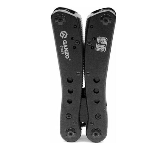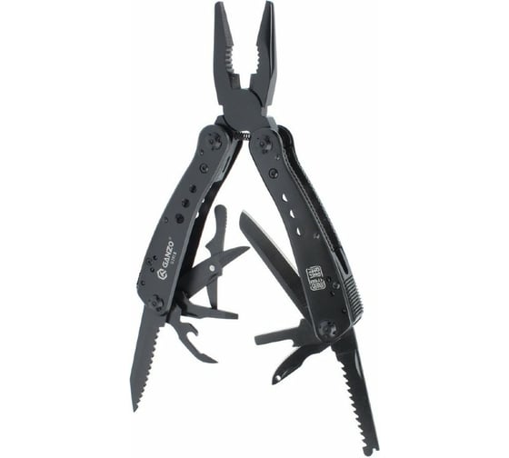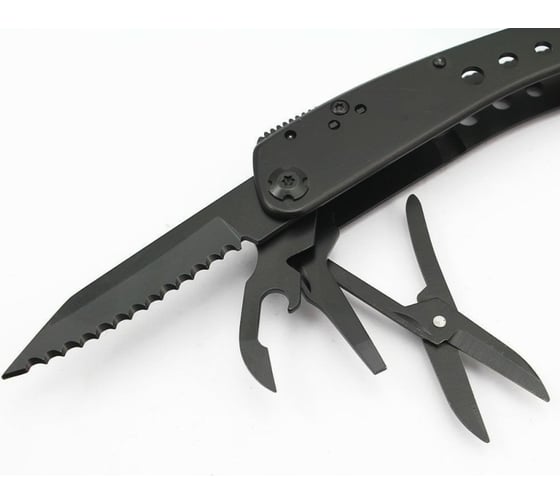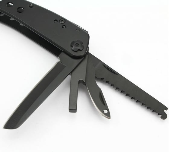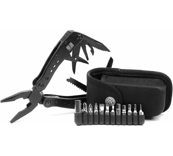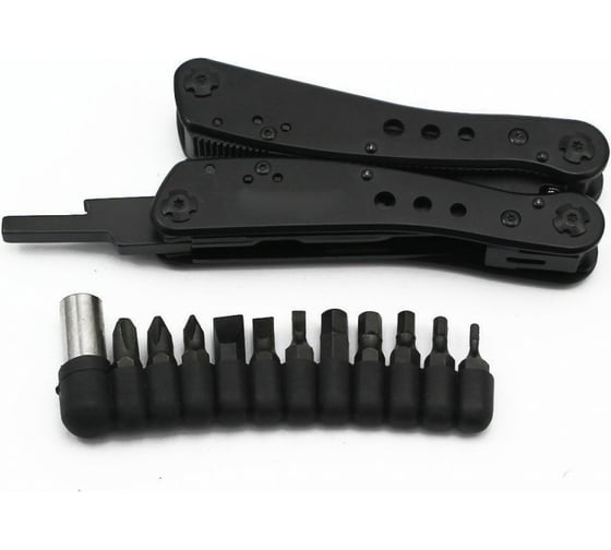 плоскогубцы, кусачки, лезвие с прямой заточкой, серрейтор, пила, плоская отвертка, шило, инструмент для зачистки проводов, открывалка, ножницы, держатель для бит