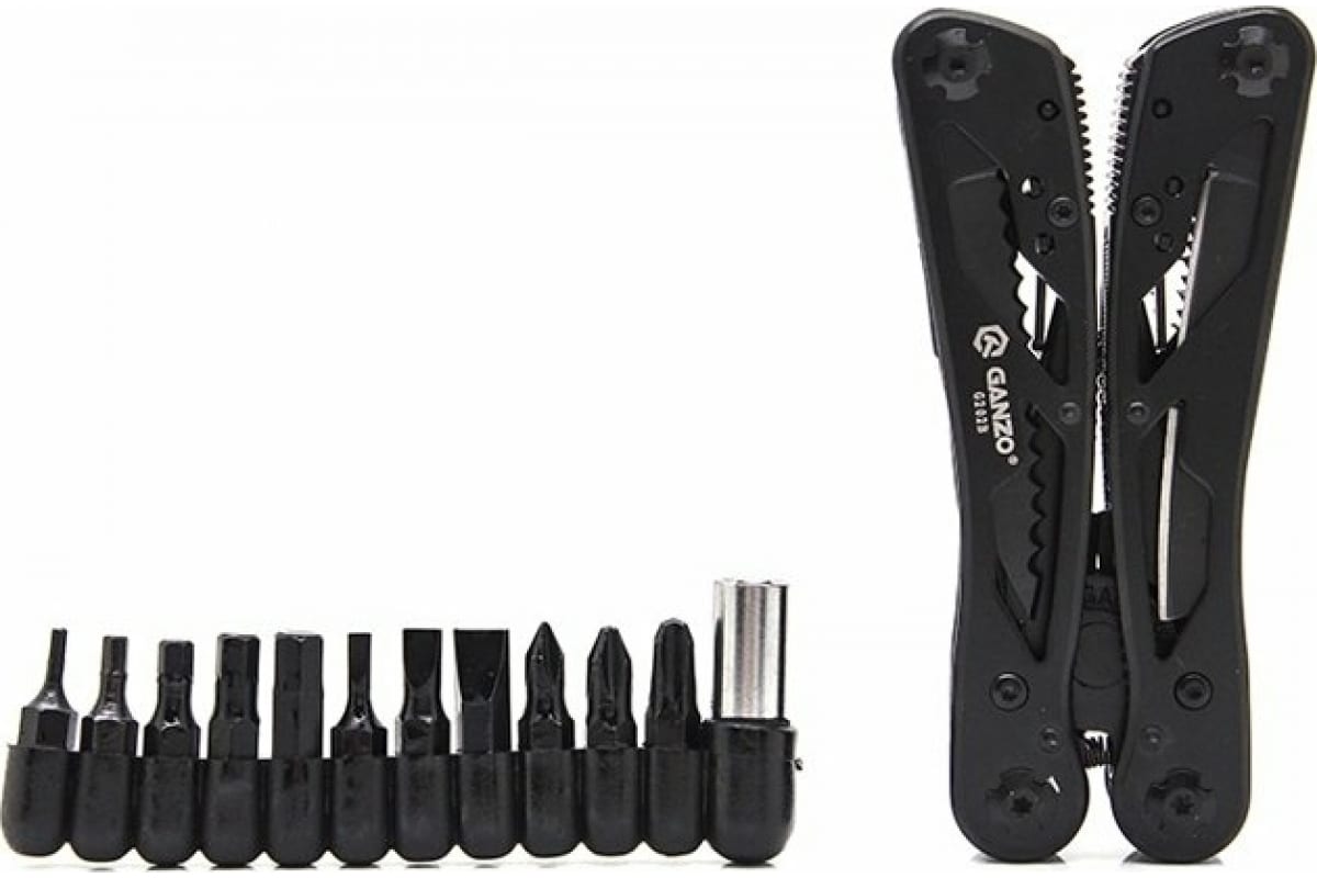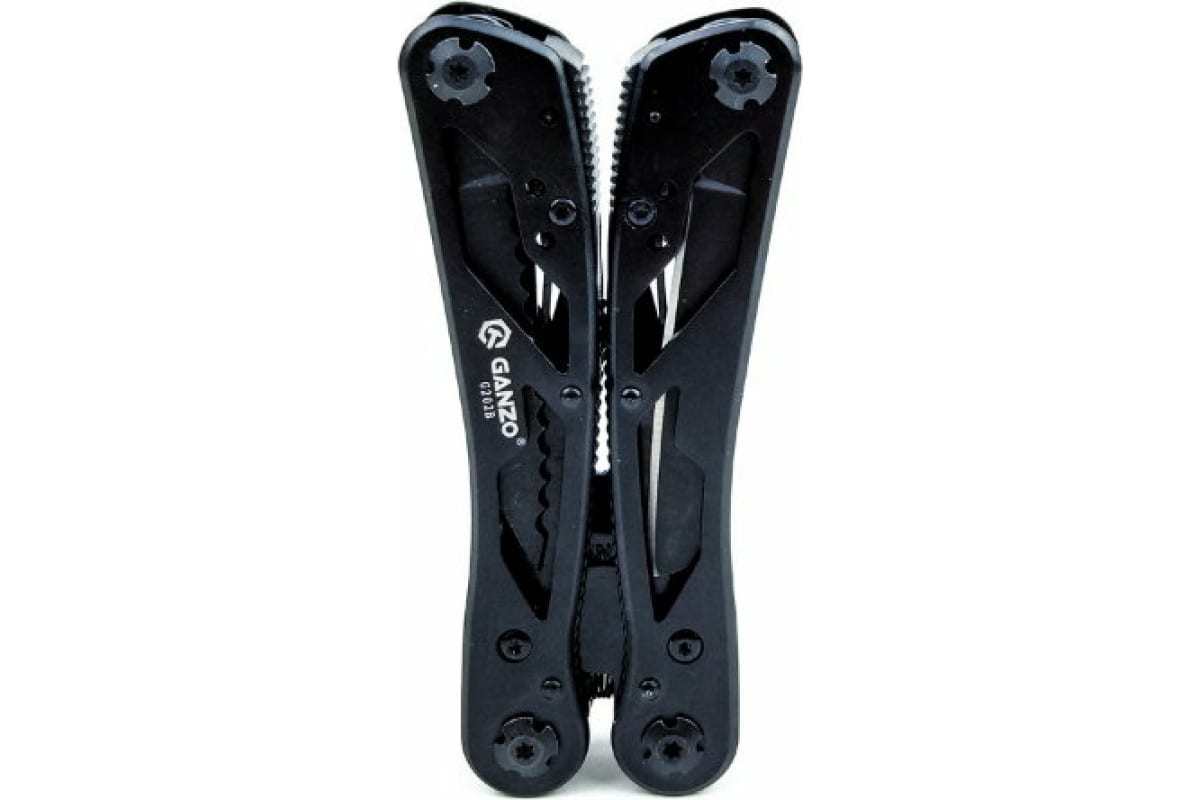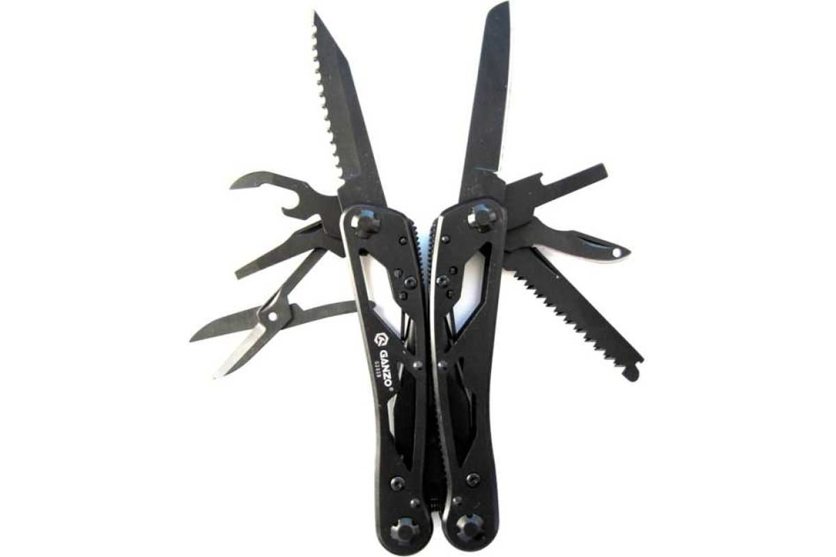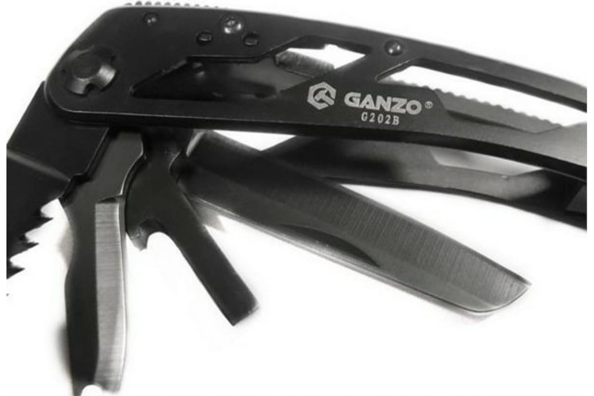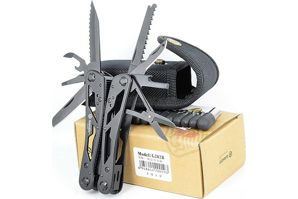 Стильный мультитул G202B от компании Ganzo. Модель имеет продуманный дизайн и большой набор инструментов. В комплект входят следующие предметы: подпружиненные плоскогубцы с кусачками, два лезвия, одно из которых имеет серрейторную заточку, плоская отвертка небольшого размера, ножницы, ножовка по дереву, зенковка, удлинитель адаптера для бит открывалки для бутылок и консервов.