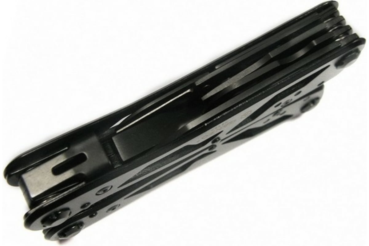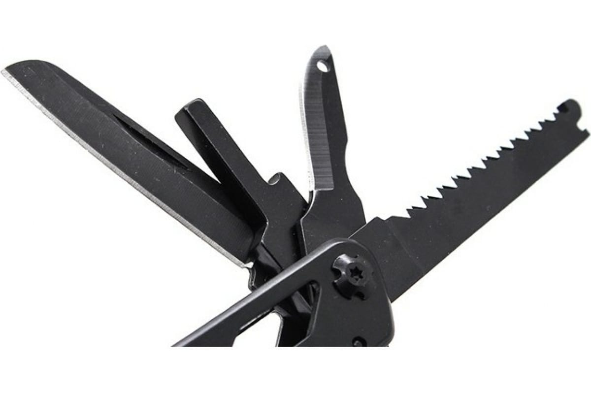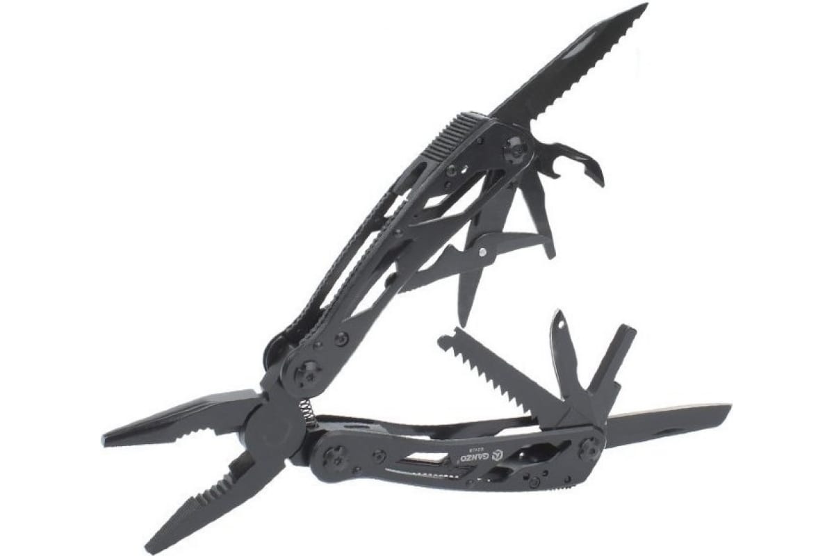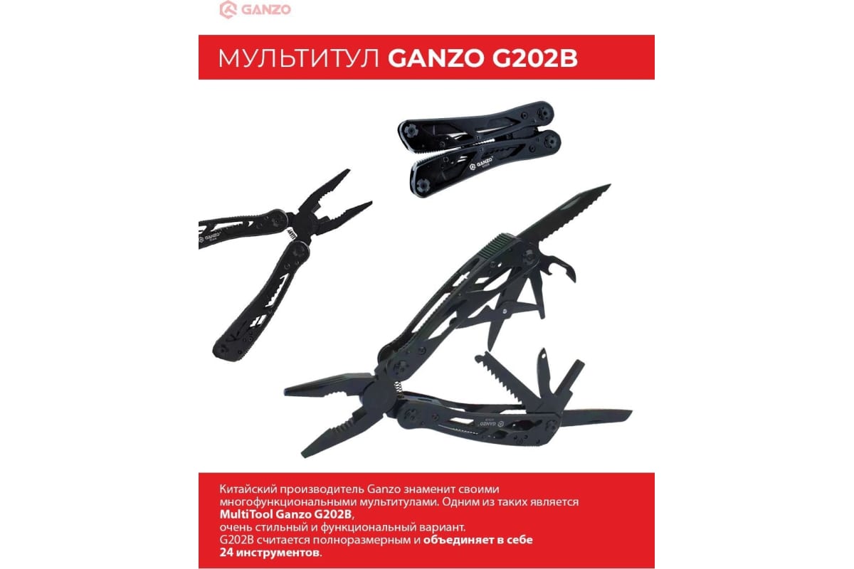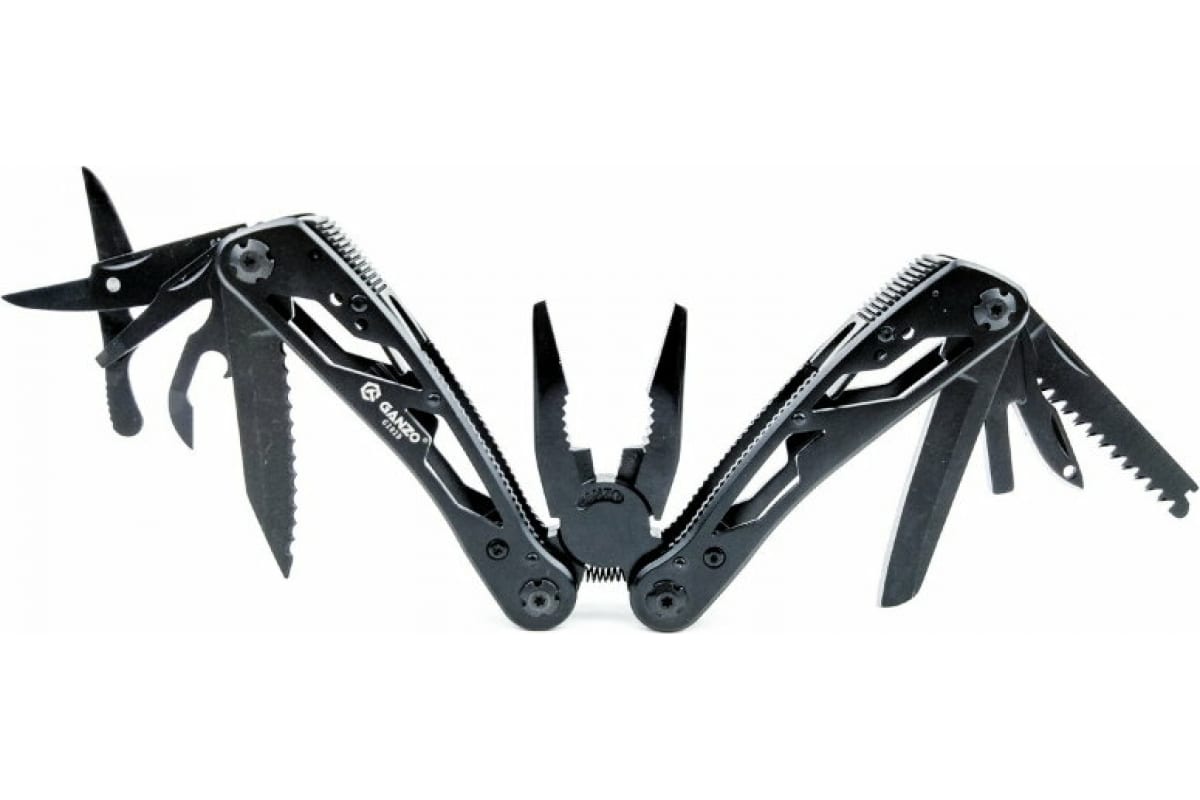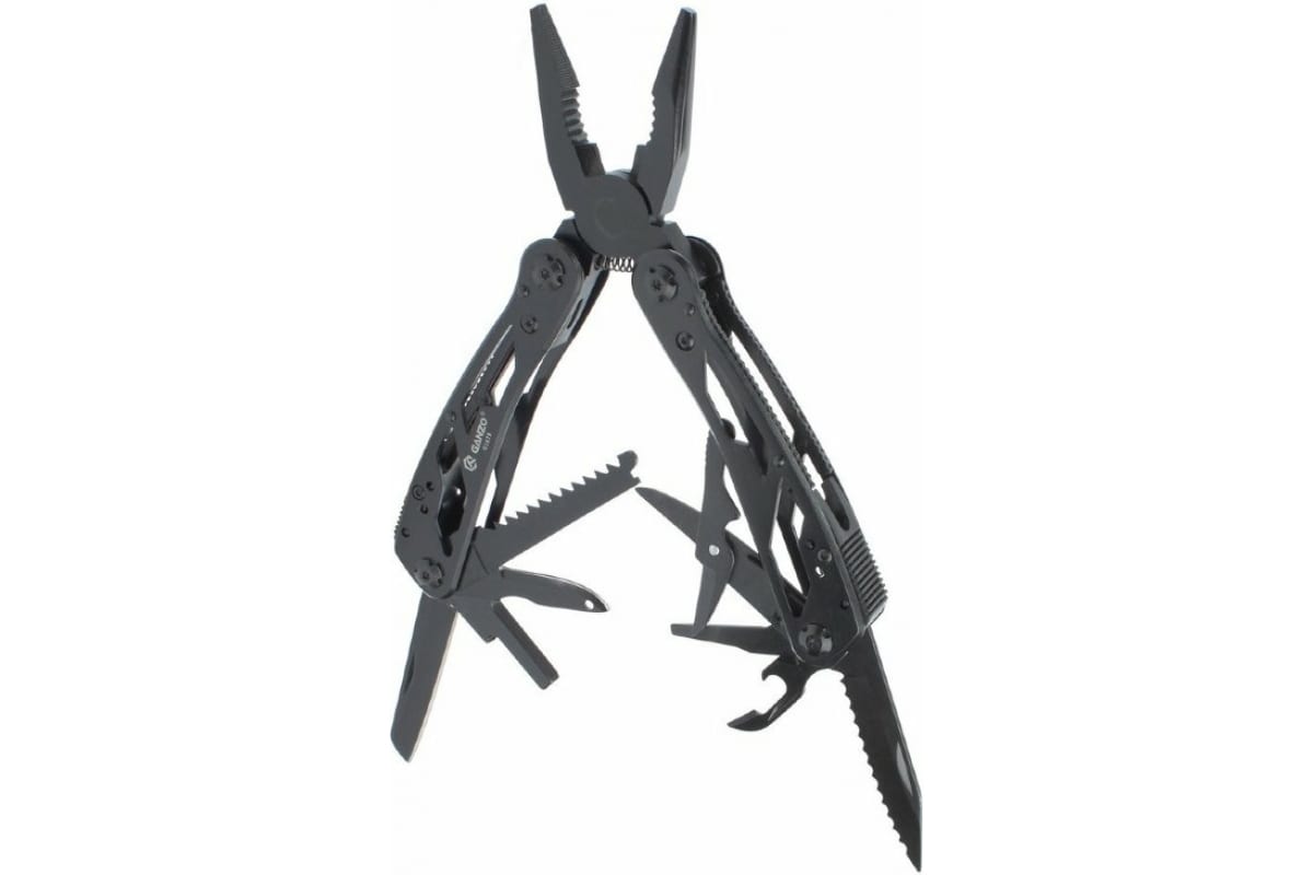 Стильный мультитул G202B от компании Ganzo. Модель имеет продуманный дизайн и большой набор инструментов. В комплект входят следующие предметы: подпружиненные плоскогубцы с кусачками, два лезвия, одно из которых имеет серрейторную заточку, плоская отвертка небольшого размера, ножницы, ножовка по дереву, зенковка, удлинитель адаптера для бит открывалки для бутылок и консервов.