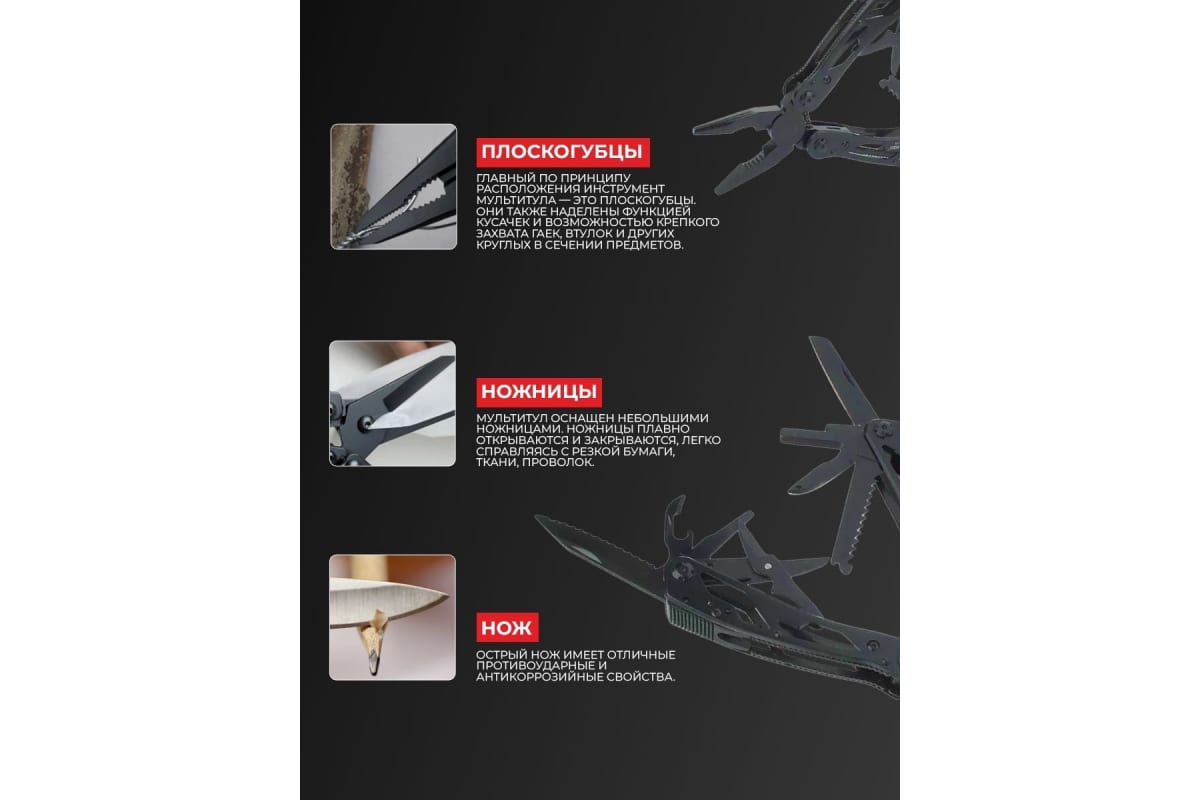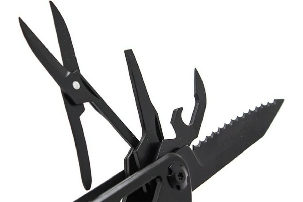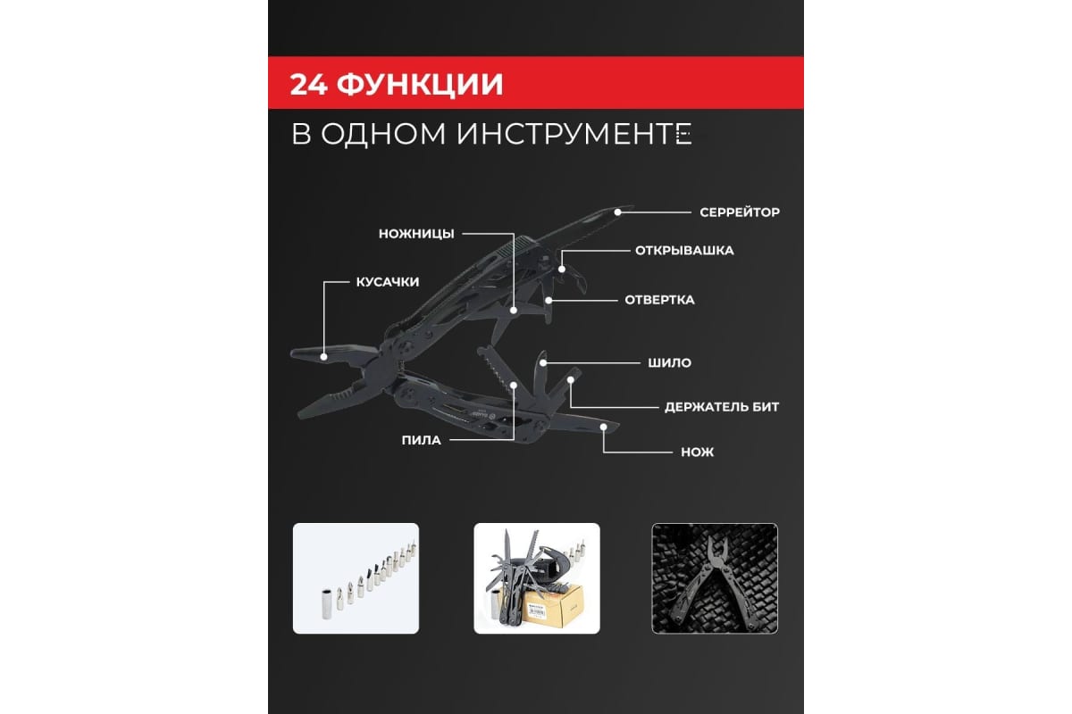 плоскогубцы,кусачки,маленькая отвертка плоская,нож,серрейтор,консервный нож,открывалка для бутылок,для снятии изоляции,пила,захват для гаек и цилиндров,ножницы,шило,держатель бит,12 сменных насадок