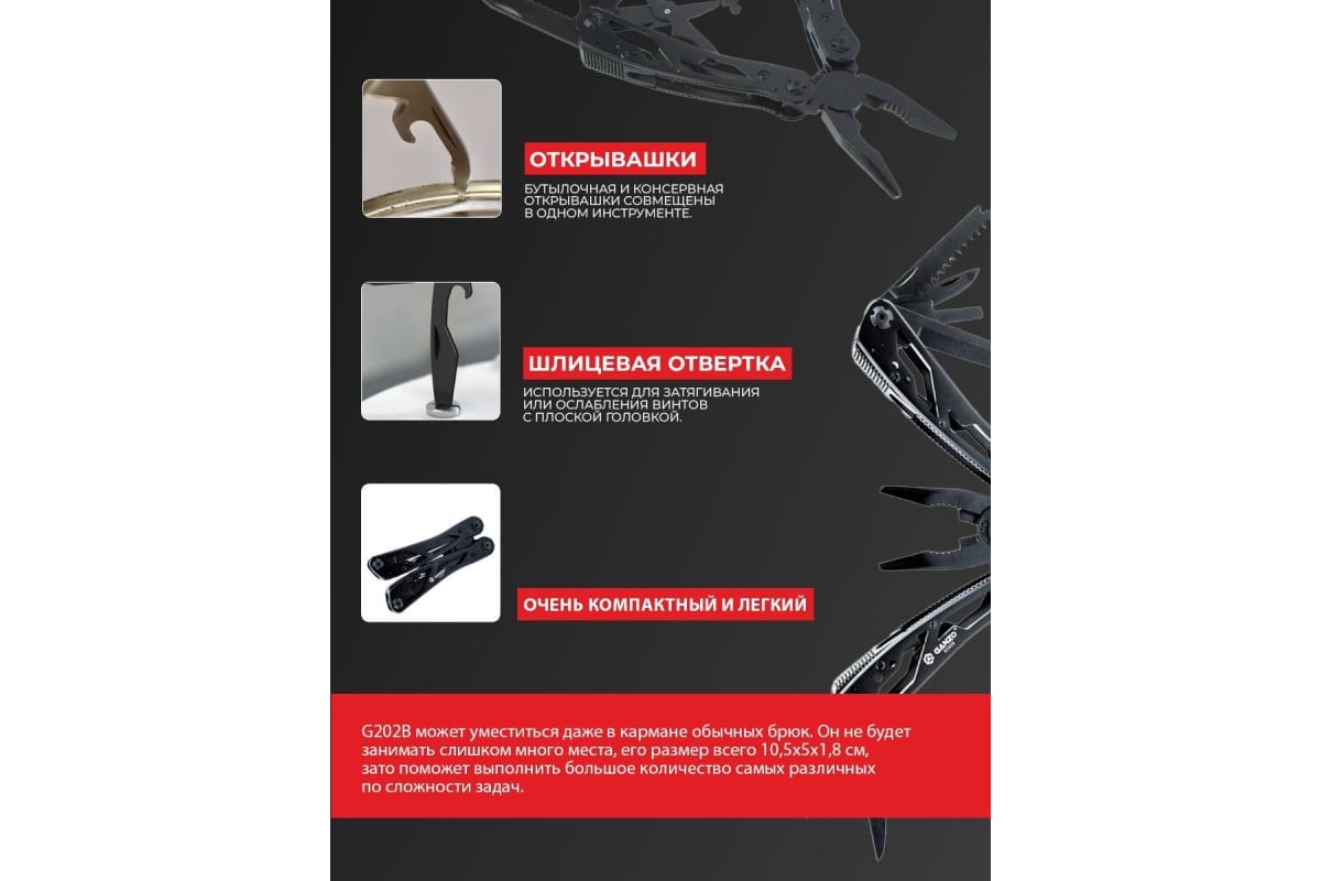 Все инструменты изготовлены из нержавеющей стали 440С. Также в комплект мультитула G202B входит набор бит из углеродистой стали. В набор, помимо адаптера, входят 3 плоских отвертки, 3 крестовых отвертки, 3 шестигранных ключа. В комплект входит чехол из синтетической ткани для переноски мультитула и бит на поясе.