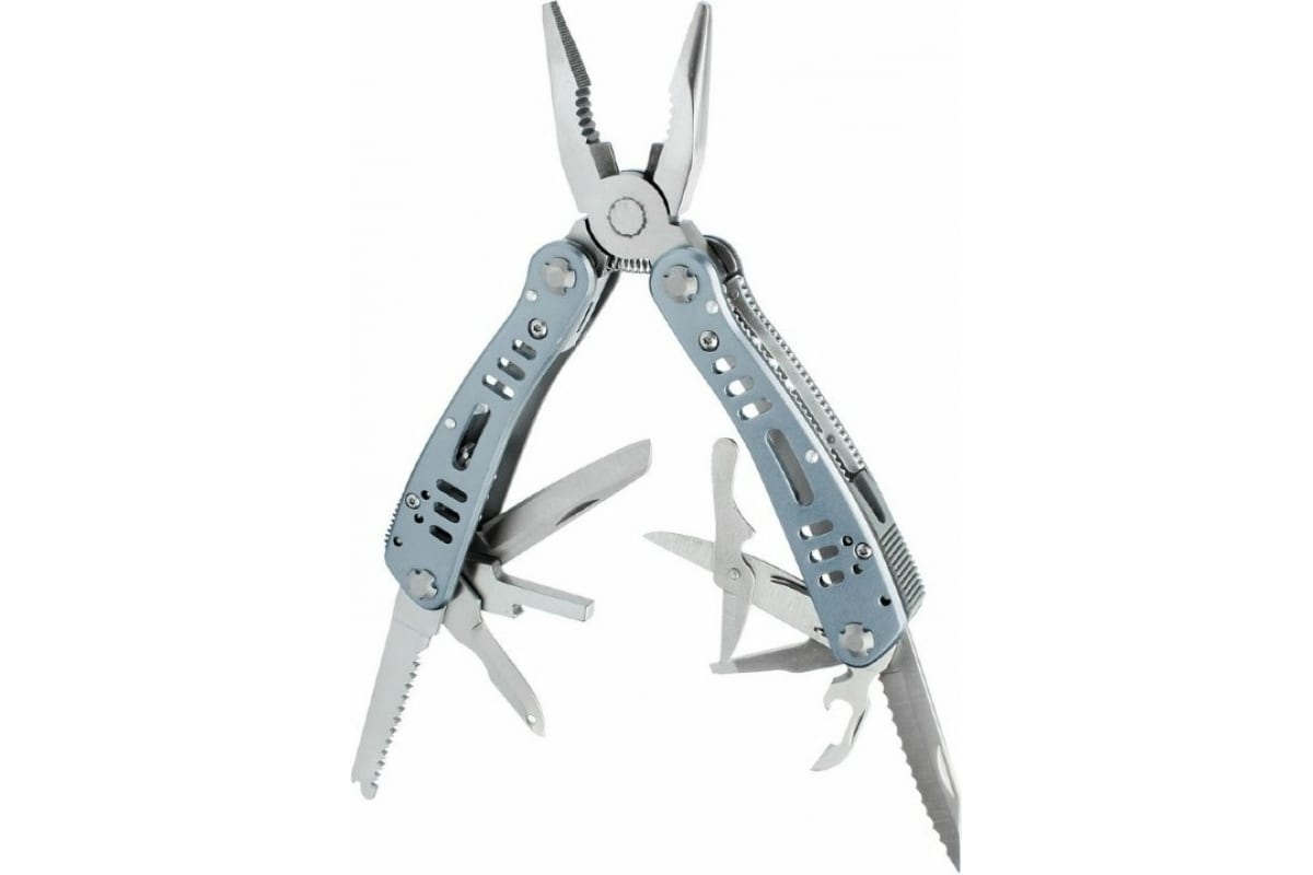 Плоскогубцы,кусачки,захват для круглых предметов,пила,два ножа разной заточки,ножницы,отвертка,открывалка,пила, шило, держатель для бит,набор съемных бит.