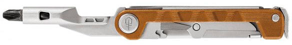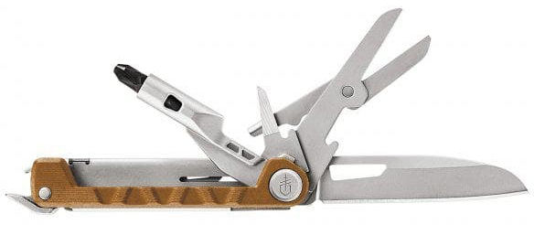 В комплект входят 8 инструментов: лезвие с гладкой кромкой, отвертка Philips, отвертка с плоской головкой, монтировка, молоток, ножницы, шило и открывалка для бутылок