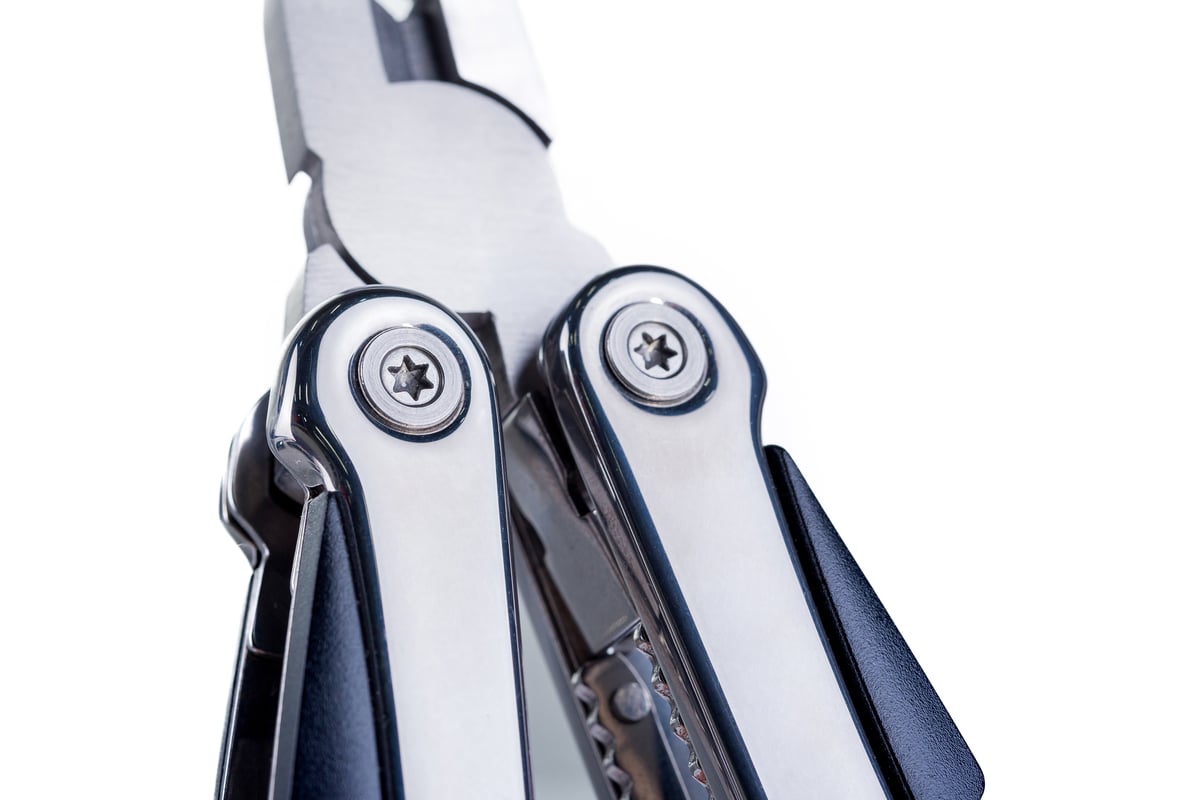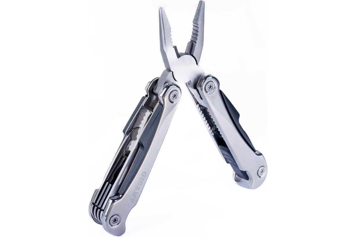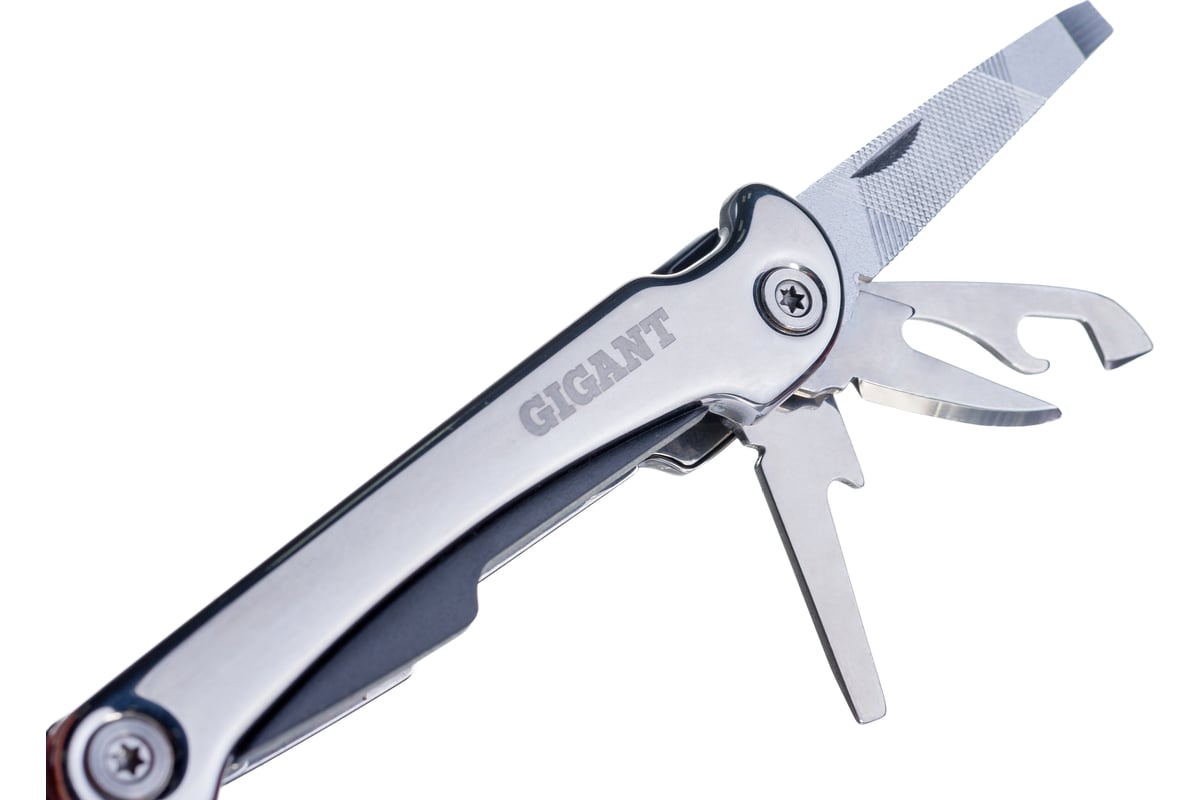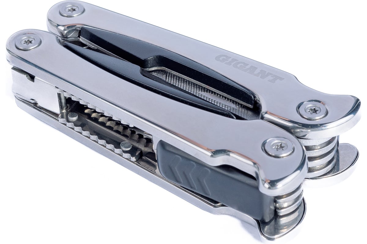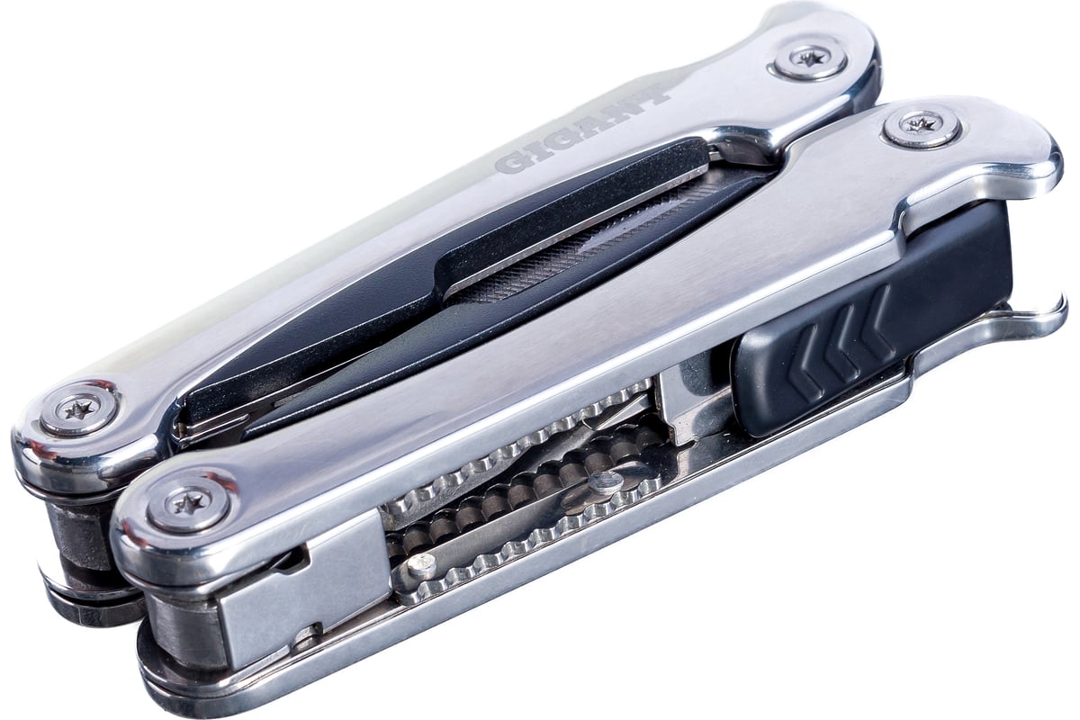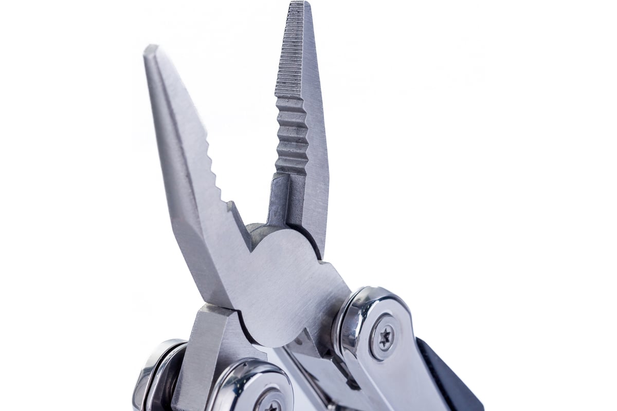 длинногубцы, плоскогубцы, кусачки, нож, крестовая отвертка, малая плоская отвертка, пила, консервный нож, открывалка для бутылок, средняя плоская отвертка, малый резак, большая плоская отвертка с надфилем