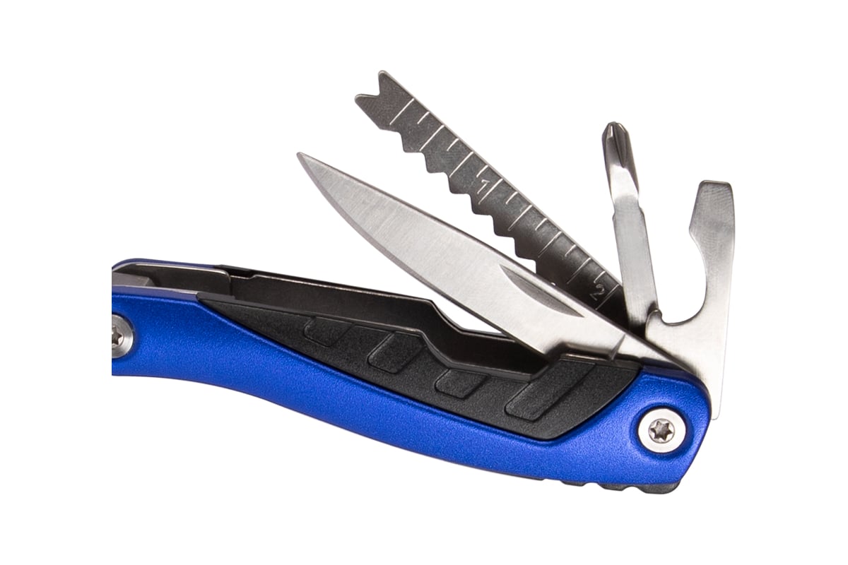 Длинногубцы, Захват для удерживания полукруглых предметов, Кусачки, Нож, Две открывалки, Крестовая отвертка, Приспособление для чистки рыбы, Приспособление для удаления крючка, Линейка, Пилка для ногтей двусторонняя, Пила, Три плоские отвертки