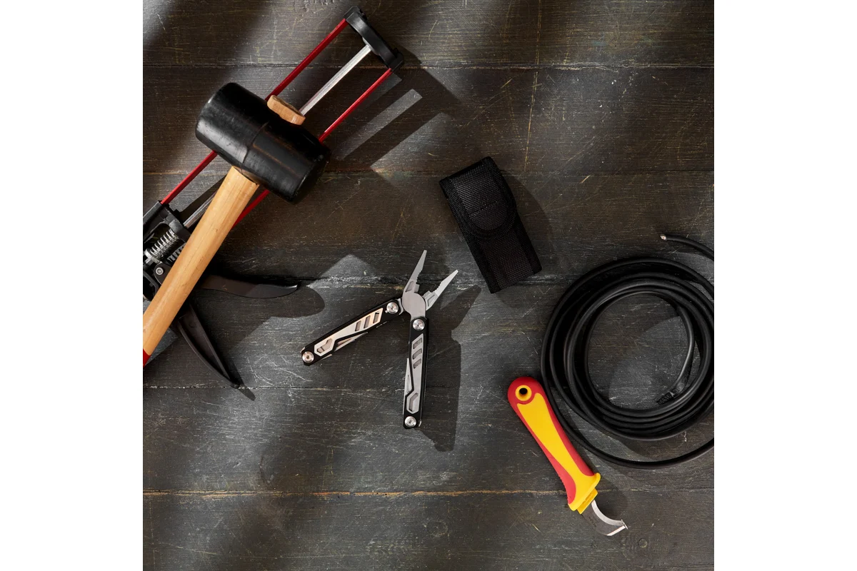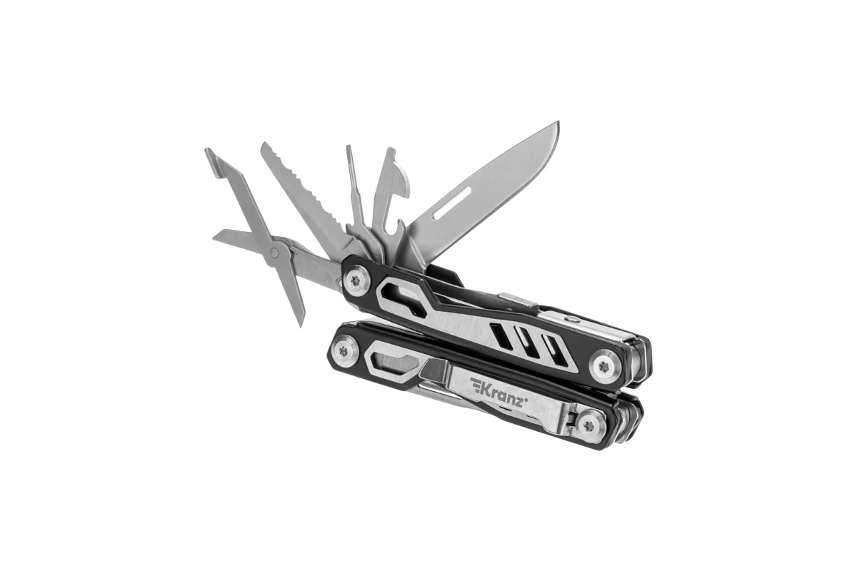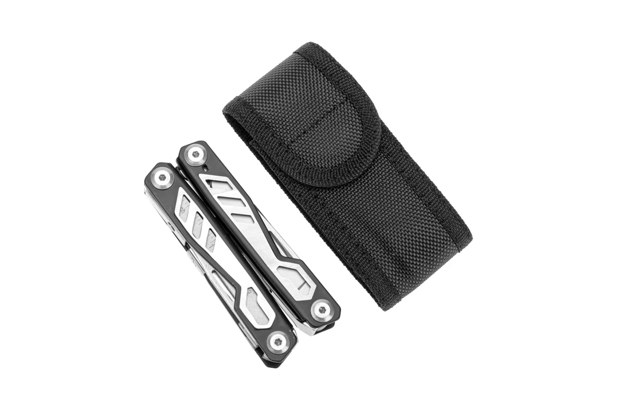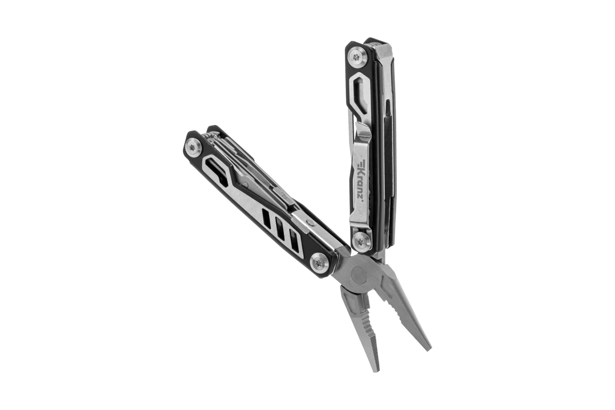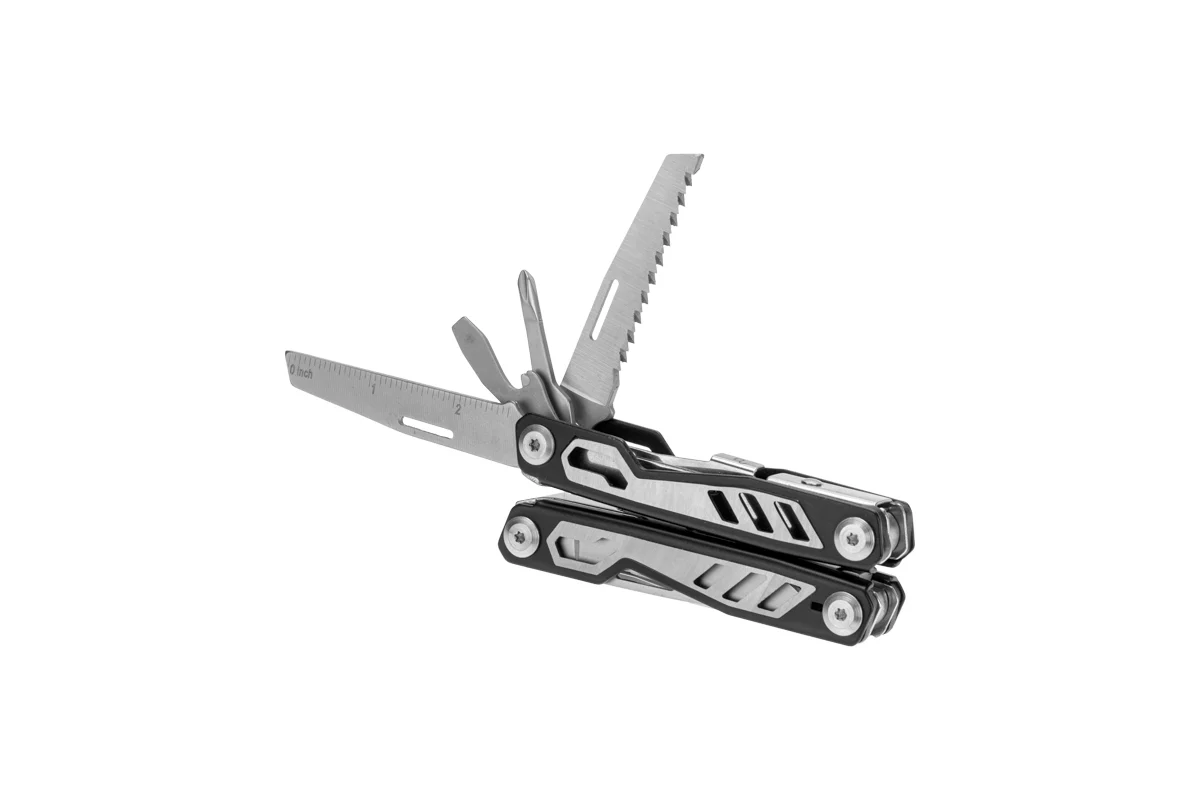 пассатижи рифленые, плоскогубцы, кусачки, инструмент для зачистки проводов, пила, открывалка для бутылок, шлицевая отвертка средняя, ножницы, открывашка, отвертка шлицевая малая, зубчатый нож, нож, шлицевая от-вертка большая, крестообразная отвертка