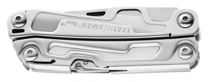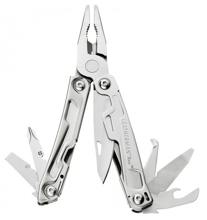 Описание Мультитул REV из нержавеющей стали: Нож 420НС,острогубцы,пассатижи,кусачки для проводов,нож для вскрытия упаковки,линейка 3,8см=1,5 дюйма,консервный нож,открывалка для бутылок, напильник по дереву/металлу, отвертка Phillips,средняя отвертка,маленькая отвертка, съемная карманная клипса.