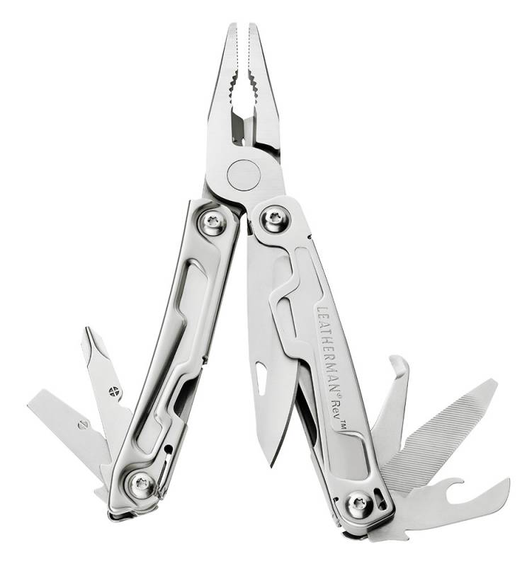 Описание Мультитул REV из нержавеющей стали : Нож 420НС,острогубцы,пассатижи,кусачки для проводов,нож для вскрытия упаковки,линейка 3,8см=1,5 дюйма,консервный нож,открывалка для бутылок,напильник по дереву/металлу,отвертка Phillips,средняя отвертка,маленькая отвертка, съемная карманная клипса