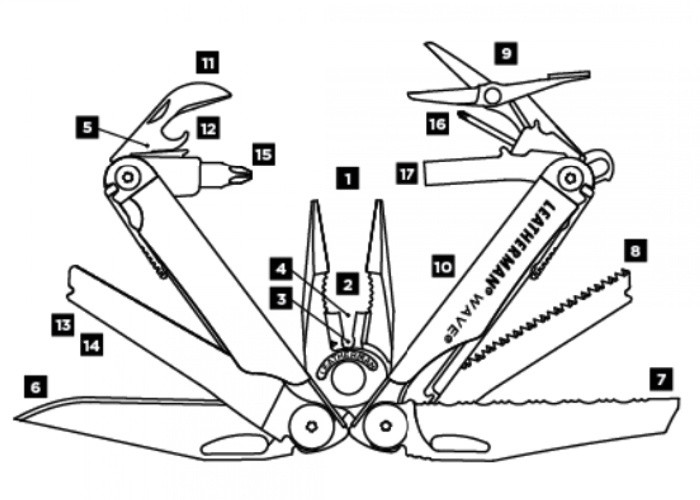 Описание: Острогубцы. Пассатижи. СМЕННЫЕ кусачки для твердой проволоки, сталь 154CM. СМЕННЫЕ кусачки для проволоки, сталь 154CM. Инструмент для зачистки проводов. Нож, сталь 420HC. Серрейторный нож, сталь 420HC. Пила. Ножницы с пружинящим механизмом. Линейка (19 cm). Открывалка для консервов.