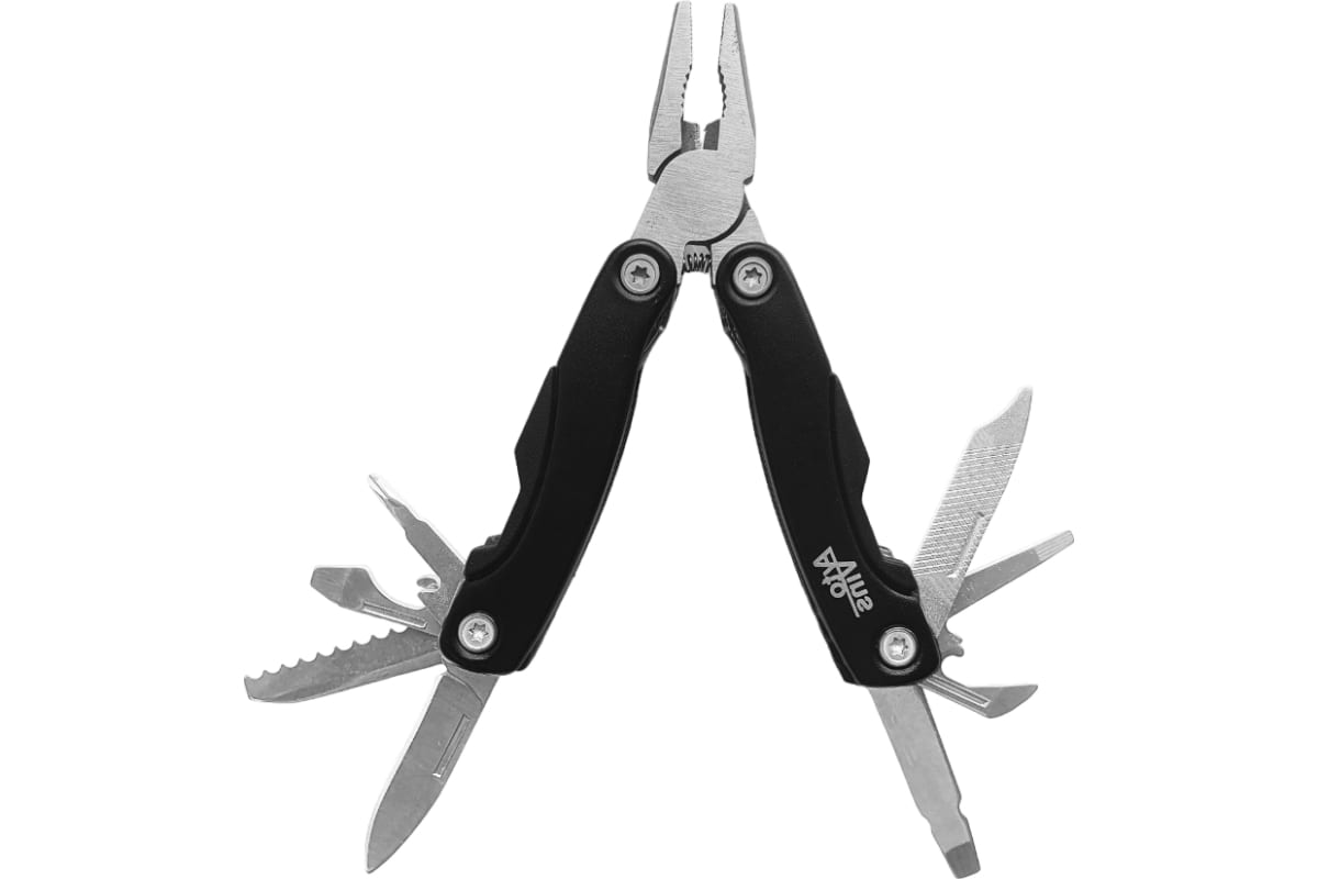 Функции: пассатижи, нож, пила 2 шт., пилка, большая плоская отвертка, открывашка, плоские отвертки, консервный нож, линейка, крестовая отвертка