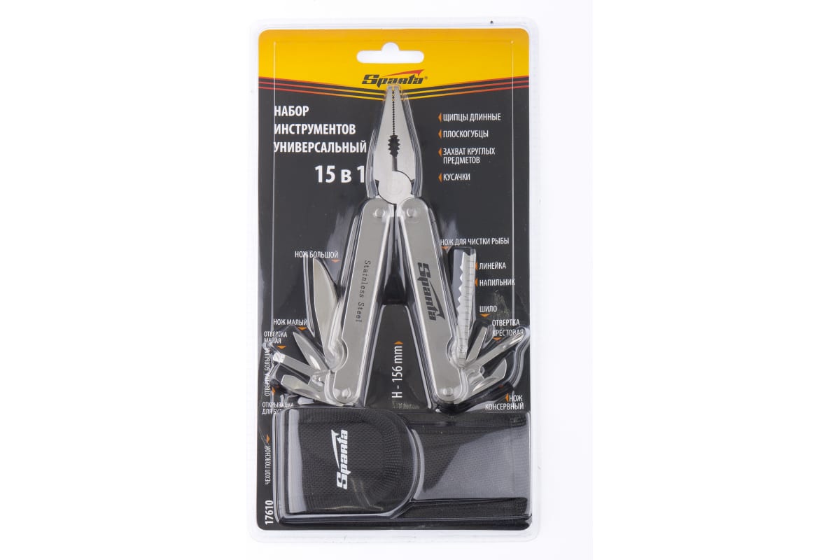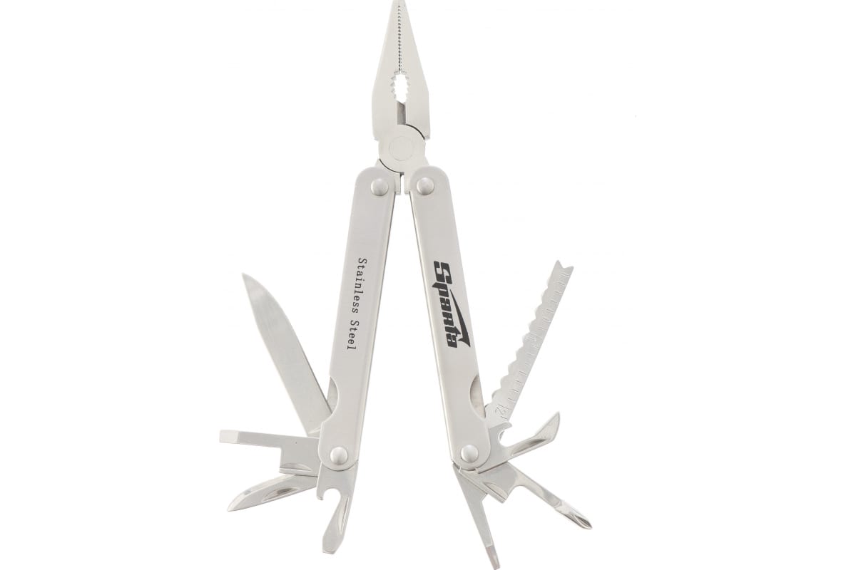 Функции: плоскогубцы, длинногубцы, кусачки, захват круглых предметов, нож для чистки рыбы, линейка, шило, консервный нож, открывалка для бутылок, крестовая отвертка, малая и большая шлицевые отвертки, малый и большой ножи
