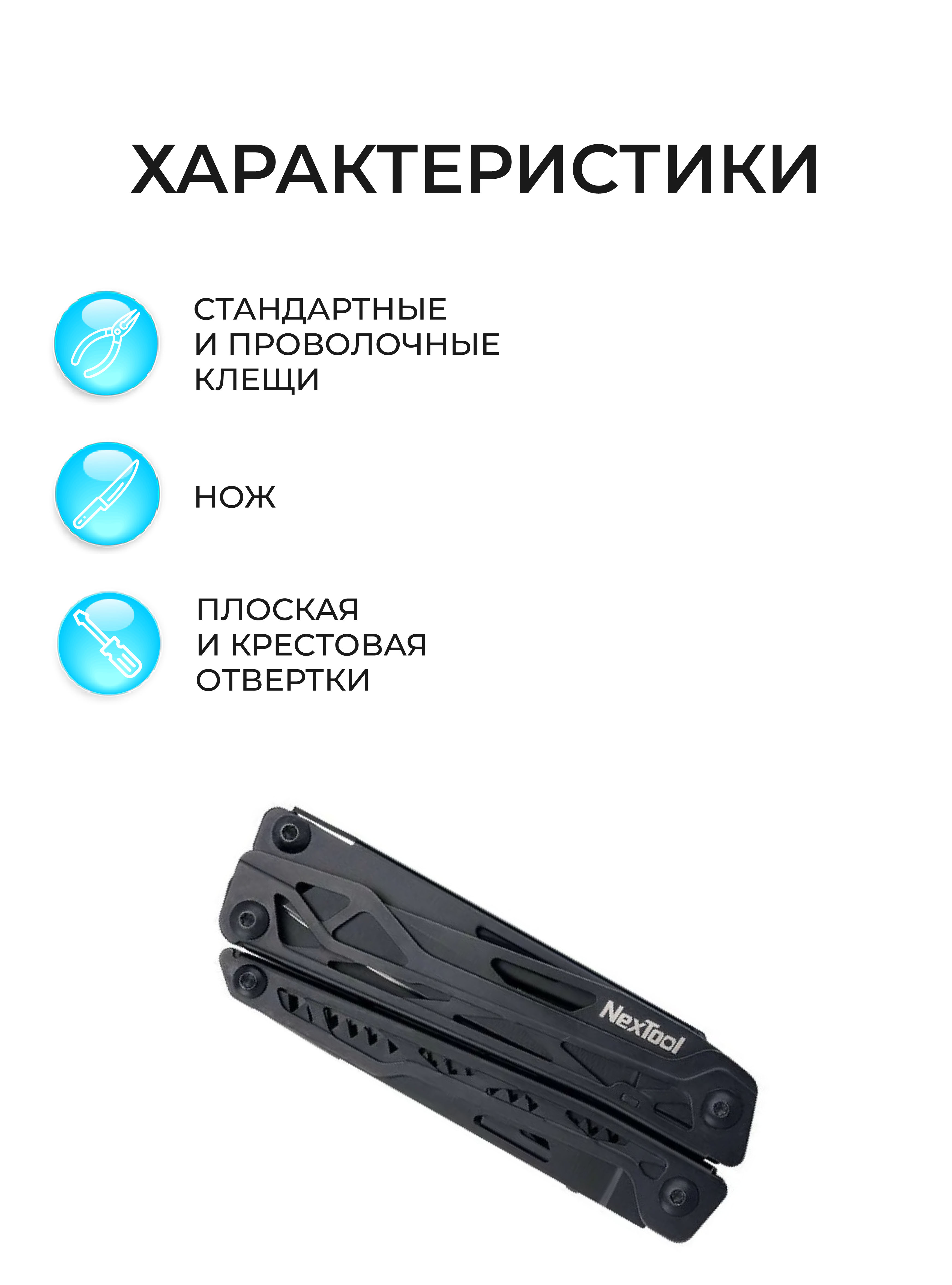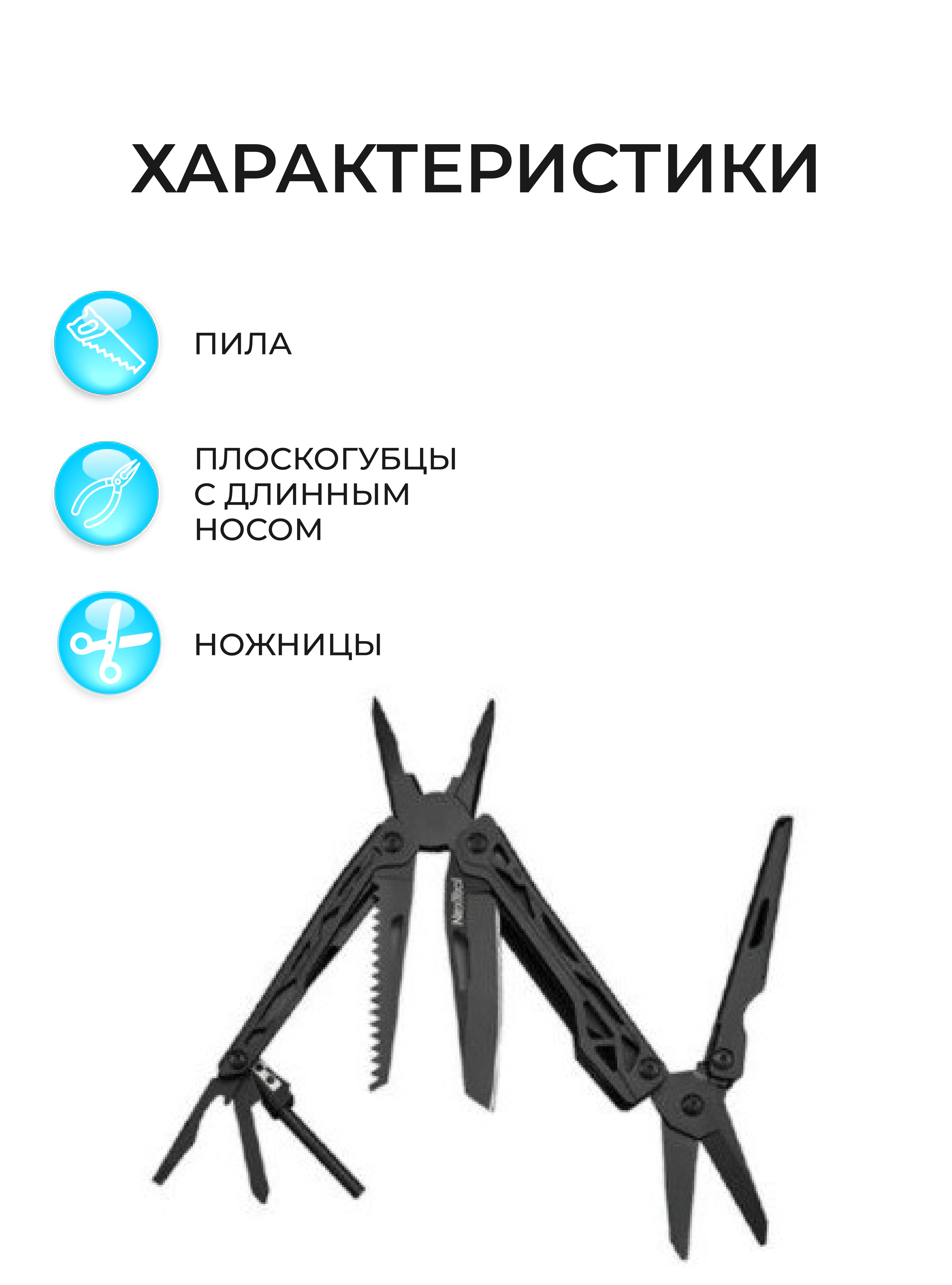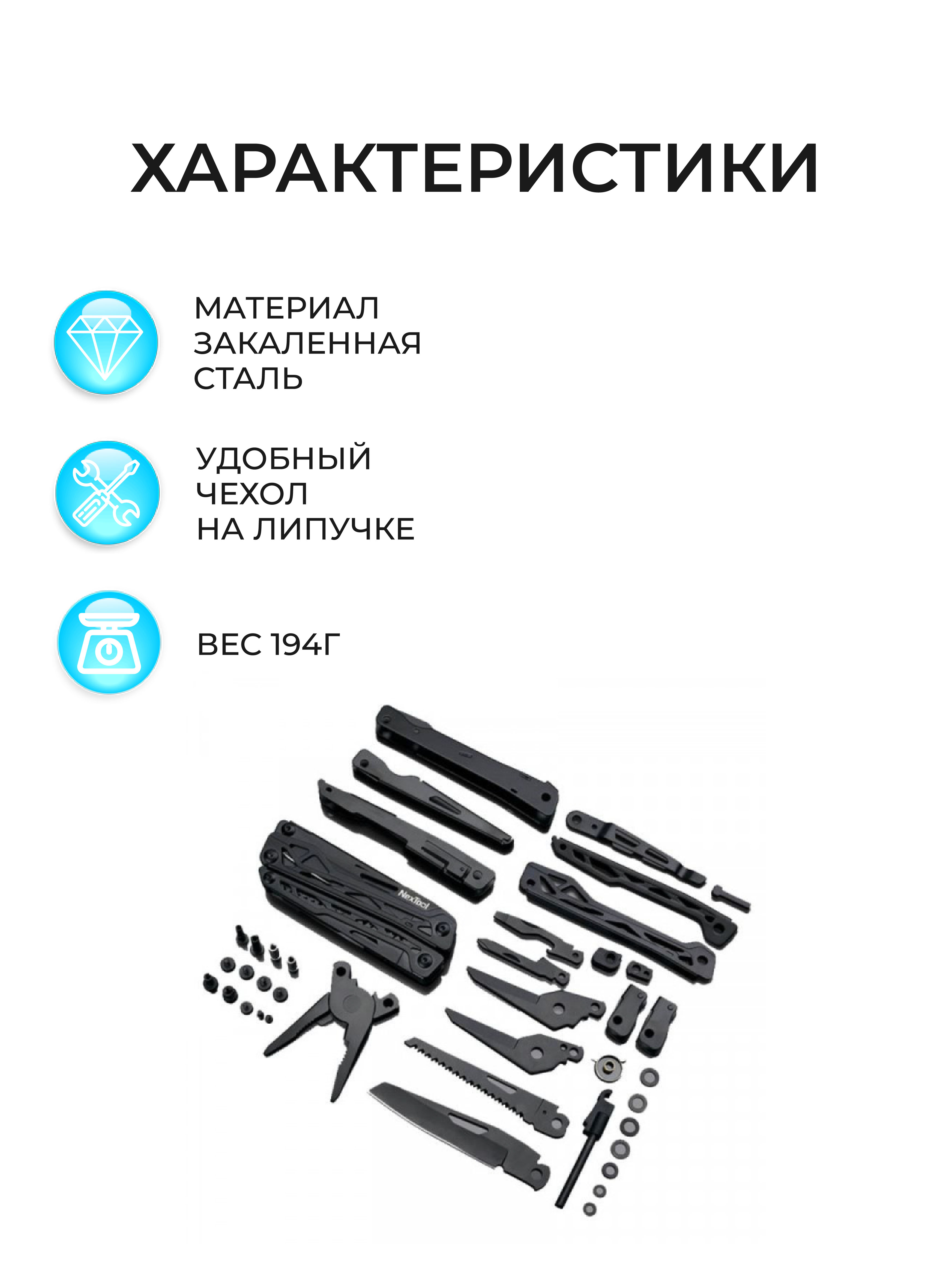 Плоскогубцы, основное лезвие, ножницы, пила и открывашка сделаны из прочного сплава HRC50, обладающей великолепной режущей силой, и обладающими антикоррозийными свойствами.