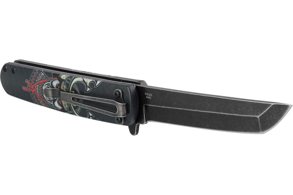 У ножа клинок формы Tanto. Подобная форма считается эффективной для колющих движений при работе с твёрдыми или плотными видами материалов. Изделие окажет пользу в туристической деятельности и активном отдыхе.
