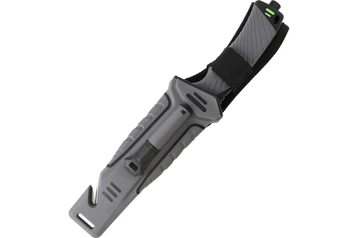 Рукоятка в данной модели может комбинировать элементы черного и оранжевого цвета, либо черного и зеленого. В этих же оттенках выполнен и чехол для ножа. Он сделан из нейлона и пластика, а нож удерживает внутри при помощи застежки-липучки.